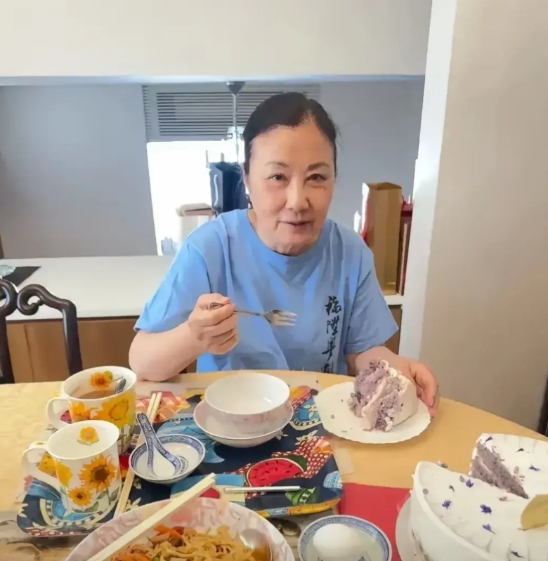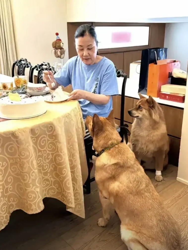 图片是汪明荃77岁生日,她的状态非常好,心态平和,虽然当天丈夫罗家英不在身边,但是有两只可爱的狗狗陪伴在旁。