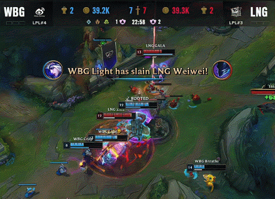 [10:03]Breathe大纳尔直接把Zika鳄鱼拍到墙上完成单杀!LNG见状不打小龙了直接Weiwei梦魇开飞强杀Xiaohu发条!WBG拿下小龙之后掩护撤退,Hang芮尔留人未果自己白给!双方1换1!