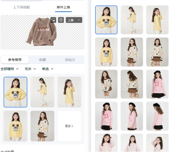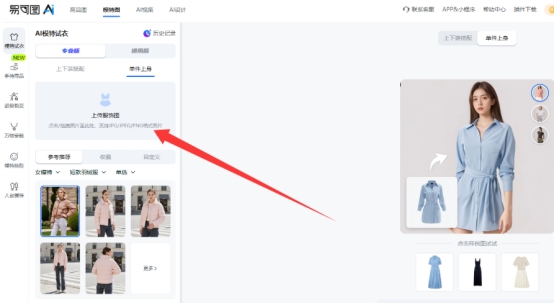 3、选择模特或上传自定义模特图:易可图提供丰富的内置模特库,并支持用户上传自己的模特图。对于不同风格需求,可选择多种姿势和人物设定。