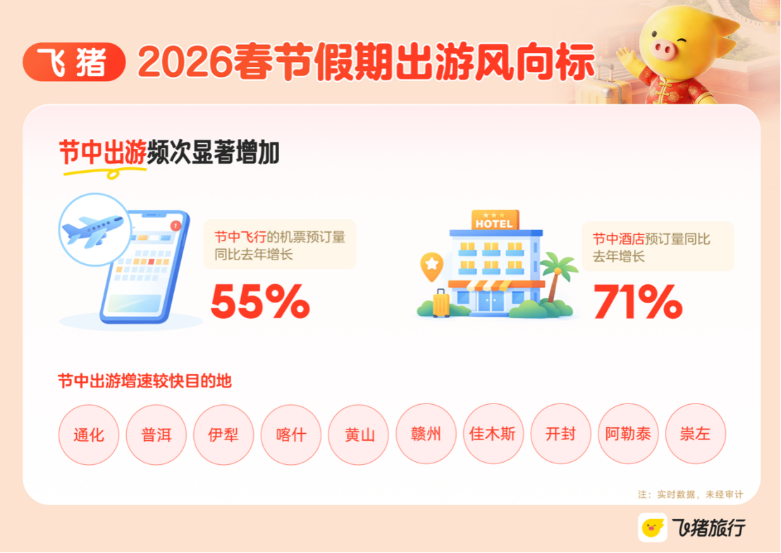 飞猪数据显示,今年杀出了一批“小众黑马”城市:比如吉林通化、云南普洱、新疆伊犁、河南开封、广西崇左等,预订增长率名列前茅。另一方面,两小时左右车程的周边游也很火,尤其西南、西北、东北一些有特色的景区城市,自驾游人气旺盛。大家利用短途旅行说走就走,既不用花太多时间规划,又能来一场“小而美”的探索。