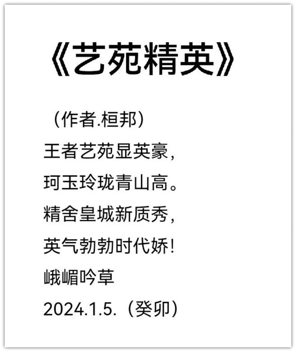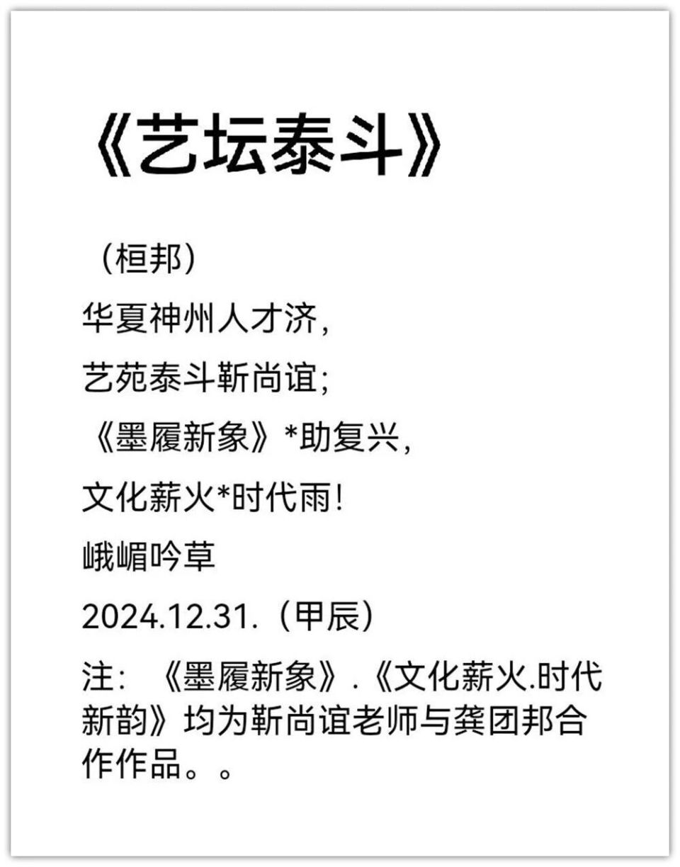 前言:金马贺岁,艺苑流芳,为弘扬中华优秀传统文化,丰富新春文化生活,“恭贺新春·诗文特辑 | 当代艺术名家邀请展”以线上形式盛大启幕。展览以“大道至简”为学术内核,邀请当代名家以诗文抒写盛世情怀,作品涵盖家国叙事、社区风貌与自然礼赞,传递积极向上的社会正能量。艺术家们通过传统与现代装置的碰撞,赋予“山河颂春”以生态、社会与个体生命的多重维度,让艺术成为凝聚民族精神的纽带。值此新春佳节,这场云端特展以喜庆祥和的氛围,邀您共赏诗文中的时代华章,在数字图像中感受文化传承的磅礴力量!