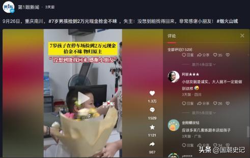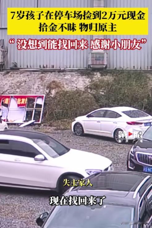 “这个男孩火了!”2024年9月重庆一男子丢了20000元现金,以为不能找回,连110都没打,谁料被7岁男孩捡到后,第一时间就交给警察叔叔!并说了一番话,令很多网友自愧不如,结局太暖心! (信息来源:第1眼新闻,2024年9月26日,《重庆南川,7岁男孩捡到2万元现金拾金不昧,失主:没想到能找得回来,非常感谢小朋友!》(文中皆为化名)) 2024年9月重庆一个普通的下午,杨宜诺跟父母在餐厅吃饭,饭后在停车场玩耍时意外发现了两沓现金。 对于一个七岁的小朋友来说这真的是很多钱。但他没有丝毫犹豫立马跑回餐厅告诉了父母,然后和父母一起报警并守在原地等待失主和警察。 监控录像显示这笔钱是一位粗心男子从后备箱取东西时不慎掉落的,他甚至开车从钱上碾压过去都没发现。 失主接到警察电话时惊喜万分,因为他压根不知道钱丢在哪儿了也几乎放弃了找回的希望。他们夫妇俩带上鲜花赶到派出所,当面向杨宜诺一家表示感谢。 杨宜诺的回答让人很感动:“别人丢了钱肯定心里很难过,这钱又不是我们的,捡到了就应该交给警察。” 他的行为让我们这些成年人既感动又惭愧。在这个物欲横流的社会里还能看到这样纯真的孩子真是让人感动。他坚守着最基本的道德底线真是太难得了。 这个孩子的举动表面看来平淡无奇但实际上很有深意。拾到东西不私藏不仅是中国人的好传统,也是大家应该遵循的社会规范。 它展现了对别人的尊重对规矩的遵循对社会责任的担当。在一个充满不确定性的社会里拾金不昧的行为就像一颗定心丸,能够重建人与人之间的信任营造和谐的社会氛围。 试想一下如果这两个孩子没有选择归还会发生什么?失主可能会焦头烂额甚至倾家荡产;而孩子即使得到了钱也会背负着良心的谴责甚至走上歧途。 而现在因为他的拾金不昧失主避免了损失,孩子收获了赞扬整个社会也感受到了温暖和希望。 杨宜诺的父母在得知孩子捡到钱后都毫不犹豫地选择了报警,这说明他们本身就具有很高的道德素养也给孩子树立了良好的榜样。 而社会各界对这两个孩子的赞扬和肯定也营造了一种良好的社会氛围,鼓励更多人拾金不昧形成正向循环。