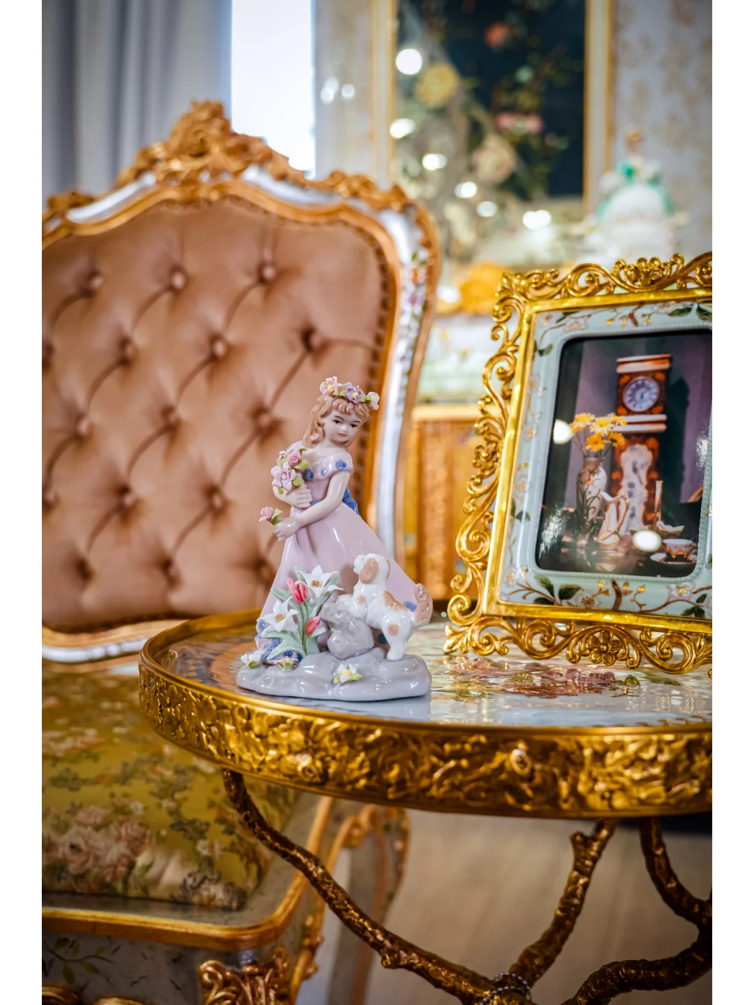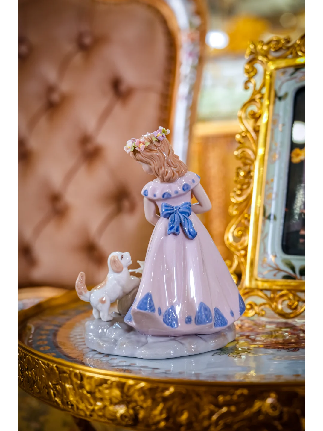 雅致的紫裙少女陶瓷摆件,与狗狗的互动形成一幅美妙动人的画面,仿佛一张宁静迷人的油画。