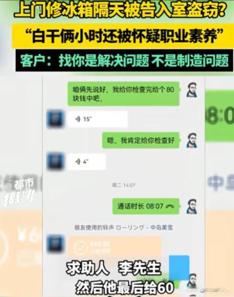 2024年11月河南郑州,女子的冰箱坏了,找了一名男子上来维修,男子剪了一根线就修好了,收费80元,但女子只给60元,男子也不计较,结果第2天,女子报了警,说男子入室盗窃,通过调解,男子需要退钱,男子不愿意了,女子表示,那不叫修冰箱,剪根线谁不会,拿走了剪下来的废料,就是盗窃。 (信息来源:都市报道,2024年11月2日,《上门修冰箱隔天被告入室盗窃?“白干俩小时还被怀疑职业素养”。》) 2024年11月一个炎热的下午修冰箱的李师傅接到电话,说是有客户冰箱坏了急需维修。李师傅二话不说放下手里的活儿就赶过去了。 一番检查发现是电路短路,剪断一根线就解决了。本来以为是个小活儿没想到却成了个大麻烦。客户觉得80元的维修费太贵只肯给60。李师傅虽然觉得委屈但还是接受了。 他收拾好工具顺手把剪下来的废电线和插头装进了工具箱,谁知第二天就被客户报警了说他“入室盗窃”。理由是李师傅未经允许带走了“属于她”的废电线。 看到这里估计很多人第一反应都是:一根废电线也值得报警?这事儿在网上也炸了锅,有人说客户太斤斤计较,也有人说李师傅处理不当。 但这事儿背后反映的其实是服务行业普遍存在的信任危机。这种信任缺失并非单方面的原因造成的,而是服务者和客户双方共同作用的结果。 从服务者角度来看确实存在一些问题。部分服务者缺乏专业素养技术不过关,却漫天要价;还有一些服务者服务态度差缺乏沟通,让客户感觉不舒服。这些都会降低客户对服务者的信任度。 但反过来看客户自身也存在一些问题。一些客户对服务价格缺乏了解,习惯性地讨价还价,不尊重服务者的劳动价值; 还有一些客户缺乏理性,容易被情绪左右,一点点小事就上纲上线。 在服务行业信任是基础,没有信任就很难建立良好的服务关系。信任的缺失不仅会损害服务者和客户的利益,还会影响整个行业的健康发展。 服务行业中的信任危机是一个复杂的问题,需要服务者和客户共同努力才能解决。加强沟通、提升服务质量、建立诚信体系,这些都是构建和谐服务生态的关键。 只有这样才能让服务行业更加健康地发展,让服务者和客户都能从中受益。