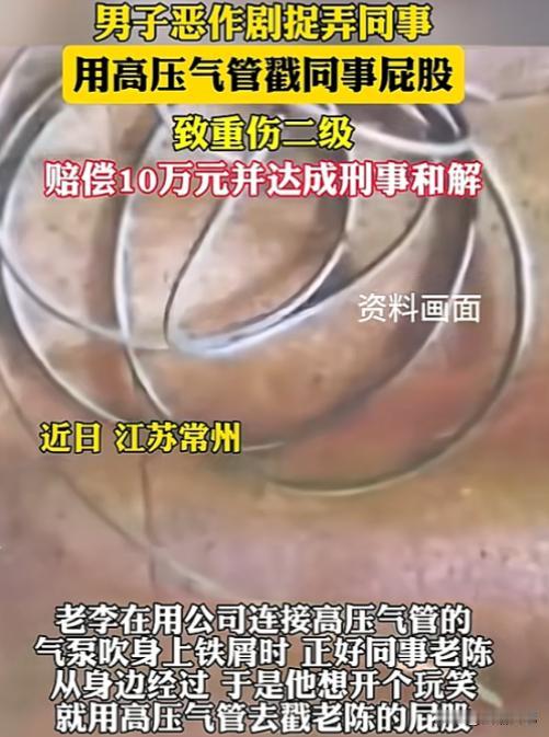 玩笑开大了!10月30日江苏,男子用高压气管跟同事开玩笑,气管里的气吹进同事的肚子,同事当场倒地哀嚎,被诊断肛肠破裂、重伤二级,男子被追究刑事责任,最终处理结果来了! (来源:半岛晨报) 10月30日本是普通的一天精工车间一如既往地忙碌着。工厂里机器声震耳工人们在忙碌地来回走动,个个都集中在自己的活儿上。 谁也没料到一场意外就隐藏在这看似平静的日常里,而导火索竟是一句“玩笑”。 一切的起因源于老李手中的那根高压气管。老李是车间的老手各种设备操作对他来说轻车熟路。那天他用高压气管吹走身上的铁屑。结束后无意间看见同事老陈从旁边经过。 或许是下班前的轻松氛围或许是一时兴起的玩心,老李想跟老陈开个玩笑。他悄悄靠近老陈将高压气管对准了他的臀部。可是这个看似平常的举动却导致了无法挽回的悲剧。 高压气流瞬间喷出老陈毫无防备地被击倒在地,痛苦地蜷缩着身体脸色苍白。车间里顿时乱作一团工友们纷纷围上前来,有人拨打了急救电话场面一片混乱。 突如其来的变故让老李瞬间懵了。他万万没想到一个玩笑竟然会带来这么严重的后果。慌乱之中他立刻关掉气阀,和闻讯赶来的儿子一起将老陈送往医院。 老李在漫长的等待中心里既害怕又自责。他不断地回忆着和老陈过去的点滴,曾经的欢声笑语如今却变成了锥心之痛。 老陈去医院检查结果出来后让他大吃一惊:他的肛肠破裂了得马上做手术。老李觉得自己犯了大错整个人都快崩溃了。 在老陈住院期间老李寸步不离悉心照料,内心充满了悔恨。而老陈经历了最初的痛苦和愤怒之后也逐渐冷静下来。 这起事故不仅仅是一个“玩笑”这么简单它触及了法律的红线。根据《民法典》老李的行为构成了侵权,需要承担老陈的医疗费、护理费等各项费用。 与此同时《刑法》也明确规定了过失致人重伤罪,老李的行为可能面临刑事处罚。老陈的家人得知消息后情绪激动要求严惩老李。 老李面对着巨额赔偿和可能的坐牢感觉无所适从,心里特别绝望。然而事情出现了转机。老陈想了很久最终决定原谅老李,还跟警察说不再追究他的责任了。 这并不意味着老李就完全没责任了。经过协商老李需要支付老陈10万元的赔偿金,这对于一个普通工人家庭来说无疑是一笔沉重的负担。 这次事故让工厂的安全教育问题凸显出来了。高压气管、高速运转的机器、化学品……工厂里充满了潜在的危险。有时候一个随意的动作或者一句玩笑话,都可能带来意想不到的结果。 这起事故也反映出工厂在安全管理上的问题。如果没有完善的安全规章制度没有定期的安全培训,类似的悲剧就可能再次上演。加强安全教育提高员工的安全意识,是每个工厂都必须重视的问题。 这起事故也让大家开始反思职场文化。在工作场所特别是存在潜在危险的环境中,人际互动应该如何把握?如何在保持良好关系的同时,坚守安全底线? 这需要每个人认真思考。职场不是儿戏任何行为都应该以安全为前提。玩笑能活跃气氛但千万不能拿安全开玩笑。尊重他人遵守规则是每个职场人都应该牢记的准则。