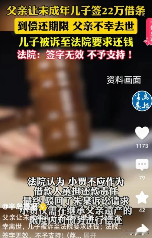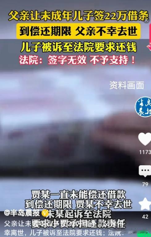 10月29日,男子去借22万,债权人要求他15岁的儿子跟他一起在借款协议上签字。不曾想,男子在还款前去世,债权人把男子儿子告上法庭,要求还款,法院判决孩子签字无效。 (案例来源:半岛晨报,) 10月29日为了给妻子治病为了维持生计,周平原向老王借了22万元。周平原是一个经营小餐馆的普通男人,妻子重病餐馆生意惨淡,生活的重担压得他喘不过气。 老王是一个放贷人精明谨慎,坚持要求借款人签订详细的协议,甚至要求借款人的家庭成员也签字以此来保障自己的利益。 在老王的坚持下周平原带着15岁的儿子小周签了协议。彼时周平原或许并没有意识到,这个举动会在未来引发一场风波。 他只想先应付眼前的问题以后的事情等以后再想办法。然而命运总是喜欢开玩笑。周平原在还款日期前突然去世留下未偿还的债务和孤儿寡母。 老王慌了神22万可不是小数目他担心血本无归。于是他将小周告上法庭,理由是小周在借款协议上签了字。老王觉得欠债还钱儿子得替父亲还。 老王没想到法院的判决结果让他大吃一惊。法官依据《民法典》的规定判决小周作为未成年人,在借款协议上的签字不具有法律效力。 小周只用在他继承的爸爸的遗产范围内还债。这个判决如同一道闪电劈开了“父债子偿”的传统观念,也照亮了现代法律对未成年人的保护。 法律也在守护未成年人的权益就像一把温暖的伞为他们遮风挡雨。《民法典》规定十八岁以下的自然人被认为是未成年人。 未成年人因为心智尚未成熟缺乏独立的判断能力和承担责任的能力,需要法律的特殊保护。小周在签署借款协议时年仅15岁属于未成年人。 他没有充分的认知能力去理解借款协议的含义和可能带来的后果。老王要求小周签字的行为本身就存在不合理之处。 法律之所以要保护未成年人是因为他们容易受到成年人的欺骗和利用。如果允许未成年人随意签署合同他们的权益将得不到保障。 法院的判决不仅保护了小周的权益,也为其他未成年人敲响了警钟:在涉及法律行为时一定要谨慎,必要时寻求成年监护人的帮助。 这起借贷纠纷看似简单但实际上反映出法律、道德和人性之间的复杂关系。它告诉我们在追求利益的时候也要遵守法律和道德。 法律是保障社会公平的最后一道屏障。它关爱弱势群体维护社会秩序促进和谐发展。 我们每个人都应该增强法律意识学会运用法律武器保护自己,也要尊重他人的合法权益。只有这样我们才能一起创造一个更公平、更和谐的社会。