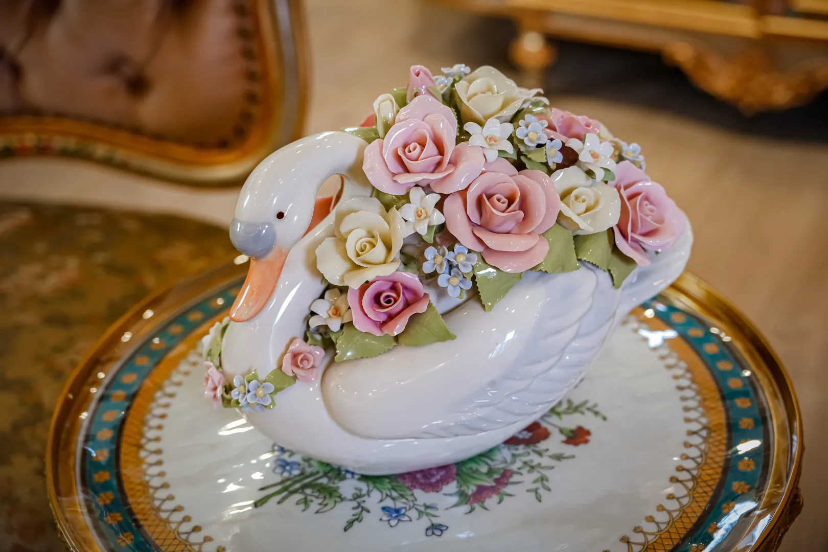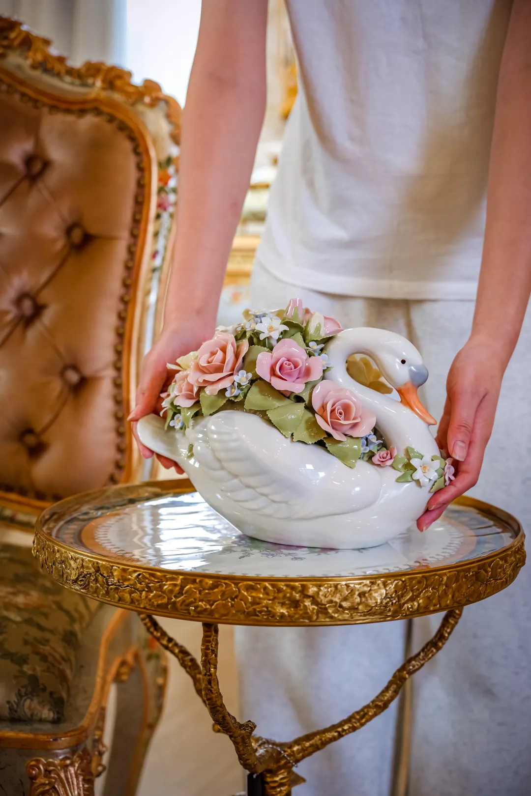 这款高温瓷手工瓷花复古天鹅摆件,浓郁的欧式复古风格,每一朵瓷花都是手工捏制,各不相同且十分雅致。瓷釉光滑润泽,细腻精美,造型更是逼真灵动,带来华丽的优雅气质。