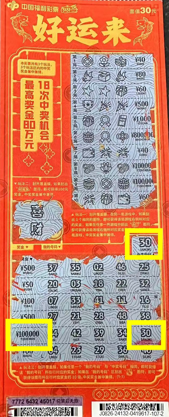 10月31日晚,她和朋友在万达金街附近逛街时,先在一个彩票站购买了两张刮刮乐,幸运的是两张都中了奖。逛了一会,又路过金街的34020219号福彩店,就想着再进去碰碰运气,于是照旧买了两张刮刮乐。万万没想到,一张30元面值的“好运来”真的给自己带来了好运气!在和销售员反复确认后才相信这是真的,真的中了10万元大奖!这是她第一次中这么大的奖,感觉就像做梦一样,激动得一夜没睡好,今天一早就来到福彩中心兑奖。