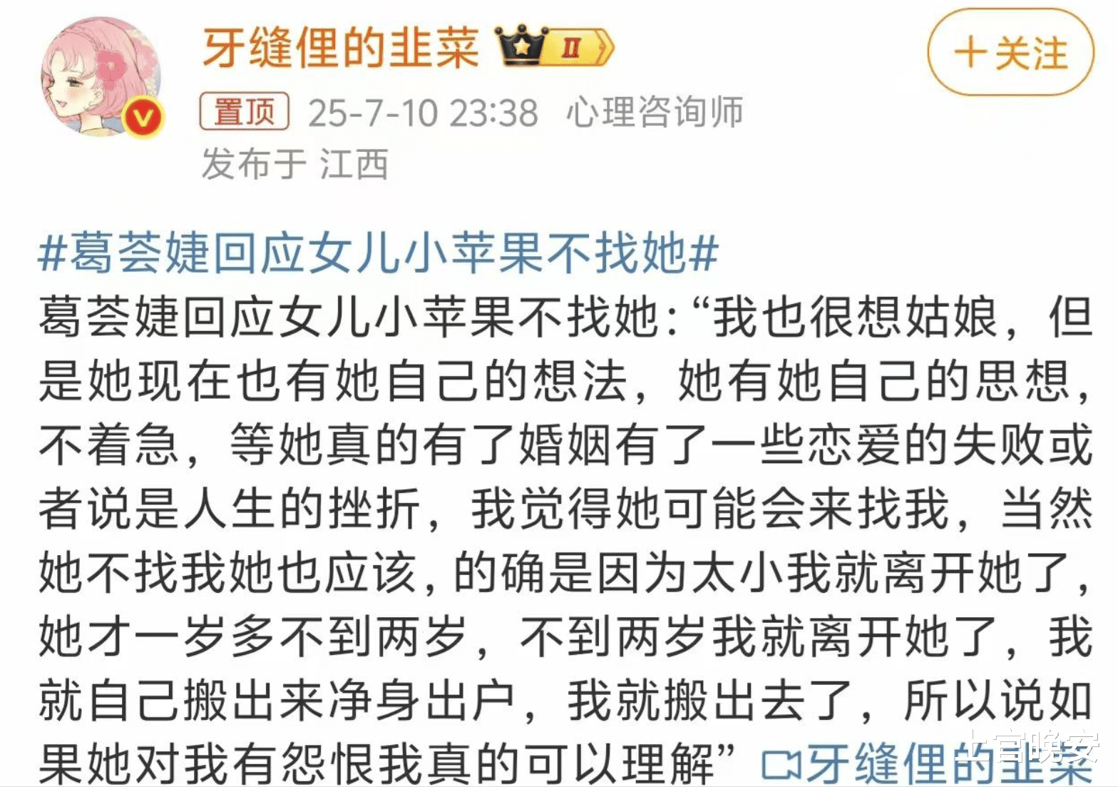 亲妈葛荟婕上个月也官宣了恋情,关于男方的信息比较少,只知道他比葛荟婕小几岁,已经谈一两年了。葛荟婕还提到可能会结婚,不过她也说结婚的前提一定是把自己的状态调整到最好才会结,因为不想耽误男方,男方比她小蛮多的。