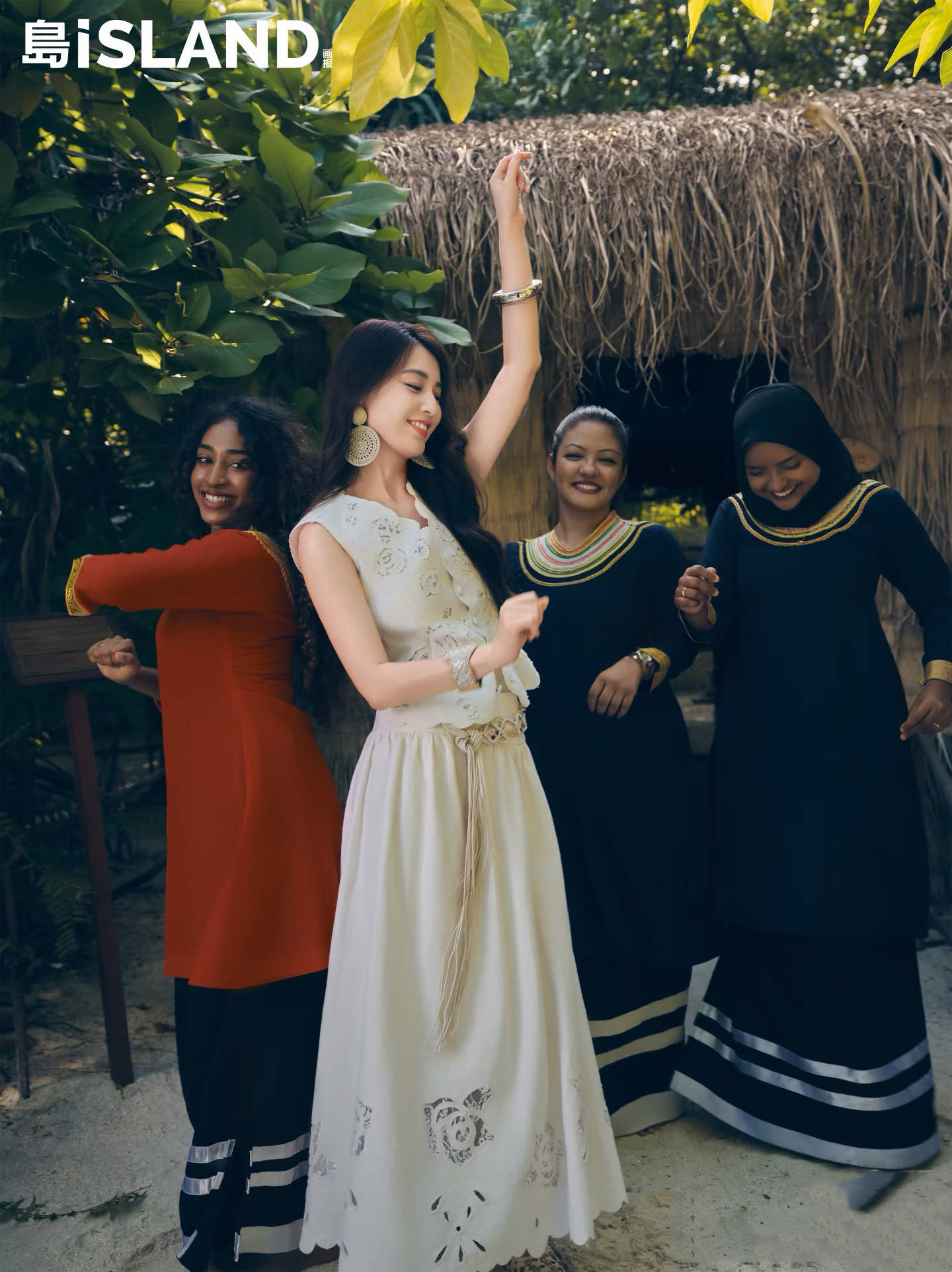 一身米白色的套裙,有一种松弛又贵气的美。黄圣依长发披肩,异域风情十足的配饰,让他融入到当地氛围中。