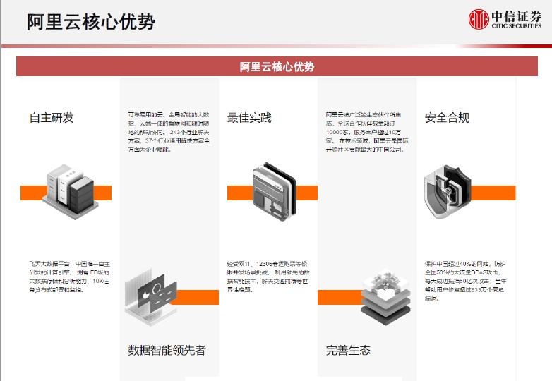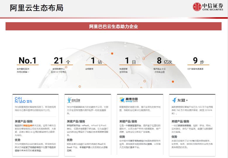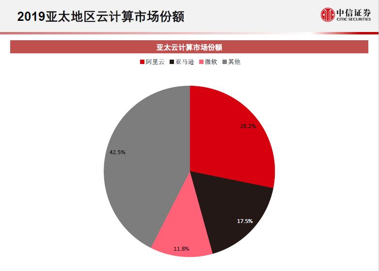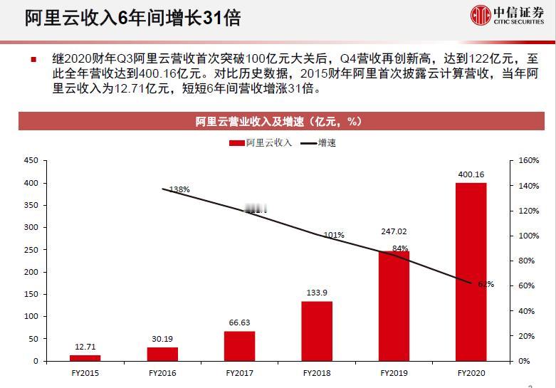 5月22日阿里发布了2020财年业绩,阿里云年收入破400亿元,比上一年度247亿收入跃升62%,业绩强劲的阿里云推动阿里巴巴估值上涨。目前阿里云已经成为亚太地区最大的云计算服务商,位列全球第三。 数据来源:阿里官网、Gartner、Canalys和中信证券研究部
