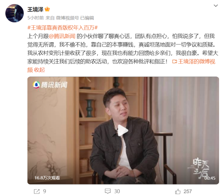 近日,王境泽在接受采访时提到,“我们‘真香’这个版权,各大企业用我们这个版权,每年要付我们版权费的”“我什么都不用做,我就可以实现我的正常消费‘财富自由’,一年能保百万(元)左右。”