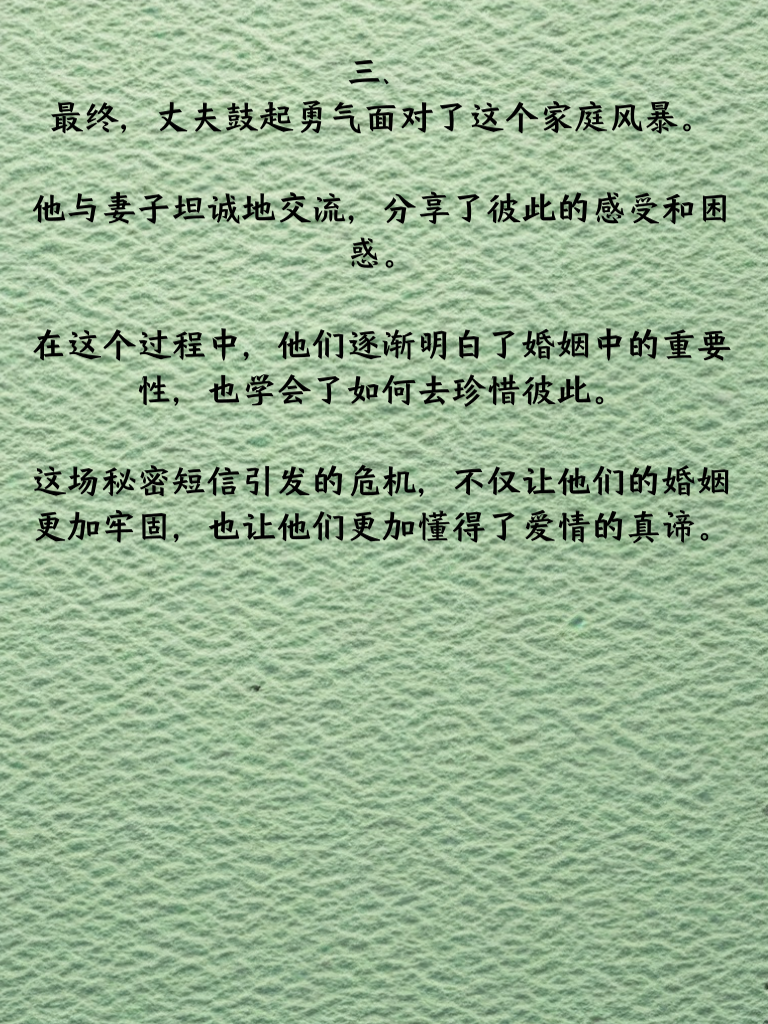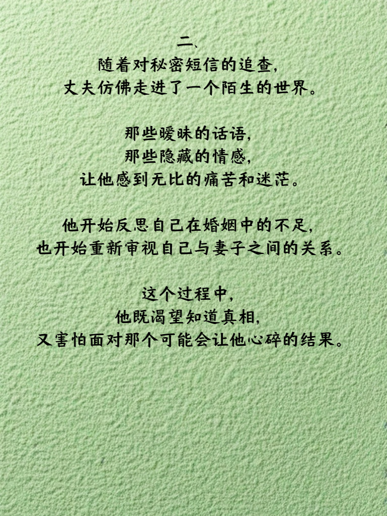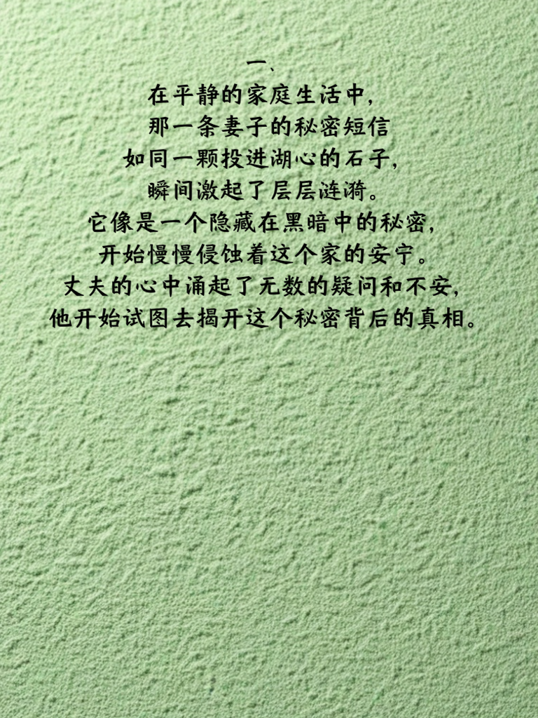 一、在平静的家庭生活中,那一条妻子的秘密短信如同一颗投进湖心的石子,瞬间激起了层层涟漪。它像是一个隐藏在黑暗中的秘密,开始慢慢侵蚀着这个家的安宁。丈夫的心中涌起了无数的疑问和不安,他开始试图去揭开这个秘密背后的真相。 二、随着对秘密短信的追查,丈夫仿佛走进了一个陌生的世界。那些暧昧的话语,那些隐藏的情感,让他感到无比的痛苦和迷茫。他开始反思自己在婚姻中的不足,也开始重新审视自己与妻子之间的关系。这个过程中,他既渴望知道真相,又害怕面对那个可能会让他心碎的结果。 三、最终,丈夫鼓起勇气面对了这个家庭风暴。他与妻子坦诚地交流,分享了彼此的感受和困惑。在这个过程中,他们逐渐明白了婚姻中的重要性,也学会了如何去珍惜彼此。这场秘密短信引发的危机,不仅让他们的婚姻更加牢固,也让他们更加懂得了爱情的真谛。