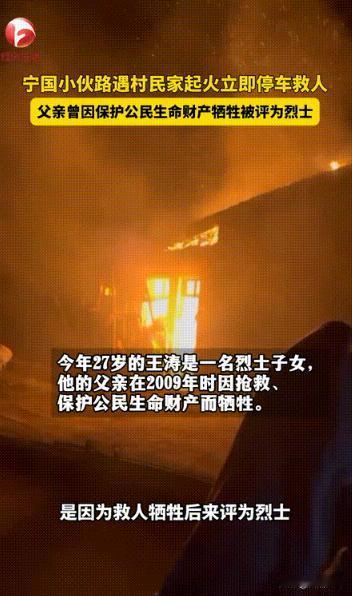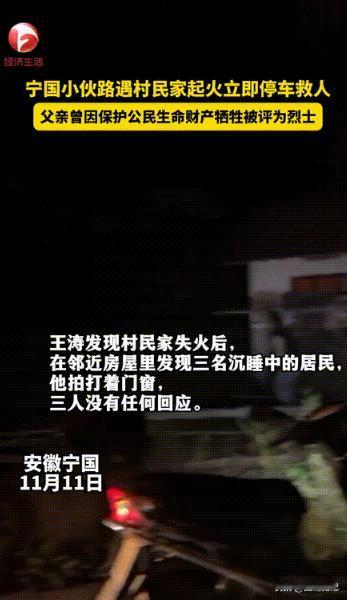 怪不得这么善良!房屋深夜着火时,3个居民还在沉睡,一小伙发现后拼命去救!后来才知道,这个小伙的父亲的身份如此特殊! (信息来源:AHTV第一时间) 这年头有人遇到危机退缩,然而有人却迎难而上,安徽一小伙在半夜突然偶遇火灾,小伙赶紧冲出去救火,为了救其他人小伙更是拼命,网友得知后感动不已,这才是真正的善良。 有人称赞他的勇敢,有人敬佩他的善良,也有人担心他的安全。毕竟冲进火场救人,本身就充满了危险。 我当时也没想那么多只想救人。王涛事后回忆道。他的话语朴实无华,却展现了一个英雄的本色。他就像他的父亲一样,在危急关头,总是把别人的生命放在第一位。 的确见义勇为是值得赞扬的,但也要量力而行,注意自身安全。毕竟生命只有一次,任何人都没有权利随意挥霍。 王涛的举动,让我们看到了人性的光辉,也引发了我们对见义勇为的思考。如何在保障自身安全的前提下,最大限度地帮助他人,这是一个值得我们每个人思考的问题。 十一月十一号,一个本该充满购物狂欢的日子,却在安徽宁国的小村庄里,被一场突如其来的大火打破了平静。 这火烧的不仅仅是房屋,更是烧在了王涛的心上。十五年前的夏天也是一场意外,夺走了他父亲的生命。如今这跳跃的火舌,仿佛是命运的回响,再次将他推到了生死边缘。 王涛的父亲王志文,是一个平凡的农民,却有着一颗不平凡的心。十五年前他为了救两名落水儿童,献出了自己宝贵的生命。 如今王涛继承了父亲的衣钵,甚至连面临的险境都如此相似。这是一种巧合还是一种宿命?或许,这就是见义勇为的基因,在父子之间默默传承。 火势越来越猛,照亮了漆黑的夜空。王涛顾不得多想冲向了火场。透过窗户,他看到三个身影躺在床上一动不动。 他们似乎对周围的危险一无所知,仍然沉浸在睡梦中。王涛用力拍打着房门,却没有任何回应。他知道时间紧迫必须尽快把他们救出来。 他立刻拨打了报警电话,同时呼喊附近的村民前来帮忙。很快他的叔叔赶到了现场。两人合力撞开了房门,浓烟和热浪扑面而来,呛得人几乎喘不过气来。 顾不上危险他们冲进屋内,将三个熟睡的人拖了出来。 被救出的三人,两个是残疾人行动不便另一个是聋哑人,听不到任何声音。如果不是王涛的及时出现,他们很可能葬身火海。在那个危机时刻,王涛的举动无疑是挽救了三条生命。 然而王涛并没有就此止步。他再次冲进火场,抢救出一些值钱的物品。他明白对于一个普通的农村家庭来说,这些财物可能意味着全部家当。 他的举动不仅挽救了生命,也保住了这个家庭最后的希望。 此时村民和警察也赶到了现场,大家齐心协力,终于将大火扑灭。看着被烧毁的房屋,王涛心中五味杂陈。他庆幸自己救出了三个人,但也为这个家庭的遭遇感到难过。 事后王涛的救人举动在村里传开了。在网络上王涛的救人事迹也引起了广泛关注。网友们纷纷为他点赞,称他为英雄、好样的。也有人表达了对自身安全的担忧,认为救人应该在确保自身安全的前提下进行。 我们歌颂英雄但我们更希望,每个人都能在力所能及的范围内,贡献自己的力量,让这个世界变得更加美好。 这才是对英雄最好的致敬,也是对生命的最好诠释。