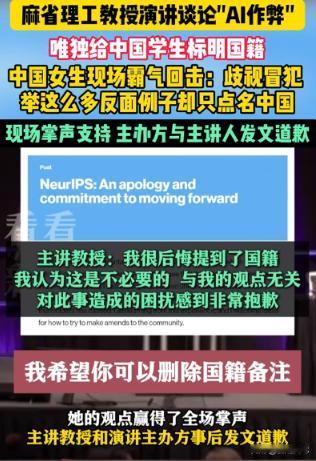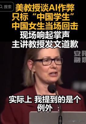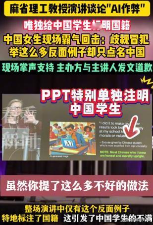 大快人心!麻省理工女教授在演讲中公开辱华,歧视中国学生!可她万万没想到,在场竟有人直接“贴脸开大。”网友:巾帼不让须眉。 (信息来源:看看新闻Knews) 什么年代了,还有外国教授敢演讲时公开辱华,近日麻省理工一个女教师,在公开演讲时直接叫嚣中国学生就喜欢作弊抄袭,然而在场的中国留学生却一点不惯着,最后现场纷纷为其鼓掌。 这件事在国内引发了广泛关注。网友们纷纷为这位勇敢的中国留学生点赞,称她硬刚教授,为中国留学生争了一口气。 有人说她是巾帼不让须眉也有人说她展现了当代中国年轻人的自信和底气。这种赞扬不仅仅是对个人的肯定,更是对国家实力提升的认同。 为什么西方学术圈这次会这么快低头道歉?答案很简单:中国的崛起。近几十年来咱们的国家在经济、科技、军事等方面可是大步流星地往前发展进步显著。 尤其是在AI领域,中国已经成为不可忽视的力量。在全球顶尖AI研究领域,中国籍科学家或者在中国工作的研究者占据了前2%的比例。 故事发生在一个世界级的AI论坛上。MIT全球顶尖学府,其教授自然也是学术圈的权威人物。这位女教授要谈的,是关于学术上不诚实的问题,本来是个挺严肃的话题。 但问题就出在她选择的案例,偏偏是中国大学的新闻。而且更让人感到不适的是,她竟然在PPT上特意标注了中国国籍。 这事儿稍微有点眼力见的都能看出不靠谱。学术讨论归学术讨论,没事儿强调国籍干嘛?这很难不让人怀疑她的动机。 这位教授在讲话时,巧妙地提到了一些关于中国学生可能存在学术诚信问题的现象。这番话虽没直接提及,但显然是在指代中国学生。 这种高级黑比直接开骂更让人难受。更过分的是她还来了一句我遇到的中国学生都很好,试图给自己洗白。 这简直是典型的阴阳怪气说法。然而她没想到的是,现场有一位中国女留学生根本不吃这套。这位女生毫不犹豫地站了起来直接开怼。 她并没有情绪失控,而是用流利、专业的英语,有理有据地质问教授:你举了这么多反面例子,却只点名中国这难道不是种族歧视吗?教授当场懵了。她真没想到有人敢这么大胆,直接质疑她的权力。 在全场观众的注视下,她支支吾吾地解释说,自己不是故意的,标注国籍只是个失误。教授的解释显然苍白无力。 因为舆论的压力,她还有主办方都不得不出来向大家说声对不起。虽然道歉了,但这件事情的负面影响却难以消除。这种问题反映出西方学术界里普遍存在的偏见和自大态度。 我国的高校培育出了众多出色的AI专业人才。中国也是全球领先的AI消费大国之一。这些都表明,中国在AI领域的影响力日益增强。 冒犯中国就等于放弃了一个大市场和高素质人才。所以教授的道歉,与其说是出于真心悔过,不如说是出于对自身利益的考量。 这事儿不光是学术圈的小争执,还折射了整个时代的影子。它反映了中国在国际舞台上日益强大的影响力,以及中国留学生在海外的处境变化。 相信在未来的中国,将更加自信地屹立于世界民族之林。