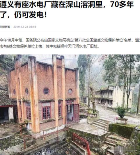 1999年,美国勒菲尔公司得知其在1942年生产的水轮机组还在一家水电厂持续巡行,且每天发电1万千瓦时,震惊之余也动了回收的心。然而面对200万美金的高价,我国却斩钉截铁的选择了拒绝。 信息来源(天眼新闻:遵义有座水电厂藏在深山溶洞里,70多年了,仍可发电!) 上个世纪战争年代,发生的令人惊叹的故事数不胜数,仅仅是一台水轮机组、几台发电机,背后却是多少人的心血,正是因为他们,我国如今的科技才能发展如此稳固。 1942年俞大维亲自飞往美国,特意买下了两套先进的发电机组,水轮机来自勒菲尔公司,发电机则是奇异公司的产品,都是业界佼佼者。可这设备怎么运回来呢? 鬼子封锁了中国的海岸线海路走不通。东西先得运到印度,然后通过“驼峰航线”再空运到昆明。这条航线穿越喜马拉雅山脉,飞行条件极其恶劣,被称为死亡航线。 但为了抗战,飞行员们冒着生命危险,一次次地飞越雪山,将这些重型设备运送到目的地。每套水轮发电机组重达百吨,运输机一次运不了那么多,只能拆成零件分批运输。 这发电机组核心重达3吨,成了当时空运物资最重的记录。设备到了昆明后,还得走滇黔公路,爬不少山绕不少弯最后才能到桐梓。 设备运到后,就开始在溶洞里安装,没有大型起重设备,全靠人工搬运,难度可想而知。经过两年多的努力,1944年天门河水电站顺利完工并开始发电了! 我国首个地下水电站,还是首个用上调速器的电站,真是了不起的工程成就。整个水电站的设计和建造,都充分考虑了实用性、保密性和防空性。 鬼子的飞机根本发现不了这个藏在深山里的秘密基地,后来全靠这个发电机带动工厂生产子弹。 回到当年,战场上火光冲天,可子弹却不够用了,这战怎么继续呢?搬!必须搬!得找个安全的地方,让这些宝贝疙瘩继续开工。挑来挑去最后选中了贵州桐梓。 兵工厂的生产线开足了马力,却遇到了一个拦路虎——缺电。贵州省的电力供应挺紧张,就一个发电厂在贵阳,距离其他地方有点远。 咱们兵工厂得自个儿备上两台大功率的柴油发电机,这机器挺耗油的,还得成立一个由30辆车组成的运输队,天天往重庆赶专程拉柴油。 山路崎岖运输效率低加上战时物资紧缺,柴油经常供应不上,兵工厂三天两头停工,急得厂长抓耳挠腮。愁眉苦脸之际,厂长注意到了溶洞里的一条河。 厂长突然有了个想法,想要试试看能不能用水利发电。于是他立马向重庆兵工署打报告,申请修建水电站。兵工署一听这主意不错当即批准。 为了把事情办好,兵工厂请来了清华大学水利系教授陈祖东当总工程师,还从清华、浙江、东北、西北、工业五所名校挖来了技术人才,组建了一支豪华的工程团队。 这五所大学的校徽现在仍清晰地标在天门河水电站机房的门框上,它们默默地记录着那一段不平凡的时光。修建水电站首先得筑坝蓄水。可当时水泥奇缺怎么办?土法上马! 将红砖磨成粉末,再混合糯米等,就这样一块块堆砌,硬是把大坝和水渠给建起来了。 据说磨粉的牛都累死了好几头,可见工程之艰巨。那时候咱们国内还做不出来,得买外国的。 如今天门河水电站已经成为一个红色旅游基地,向人们讲述着那段战火纷飞的岁月,以及两台老机器背后的故事。 这些设备不只是冰冷的金属,更是我们民族坚韧抗战意志的标志。