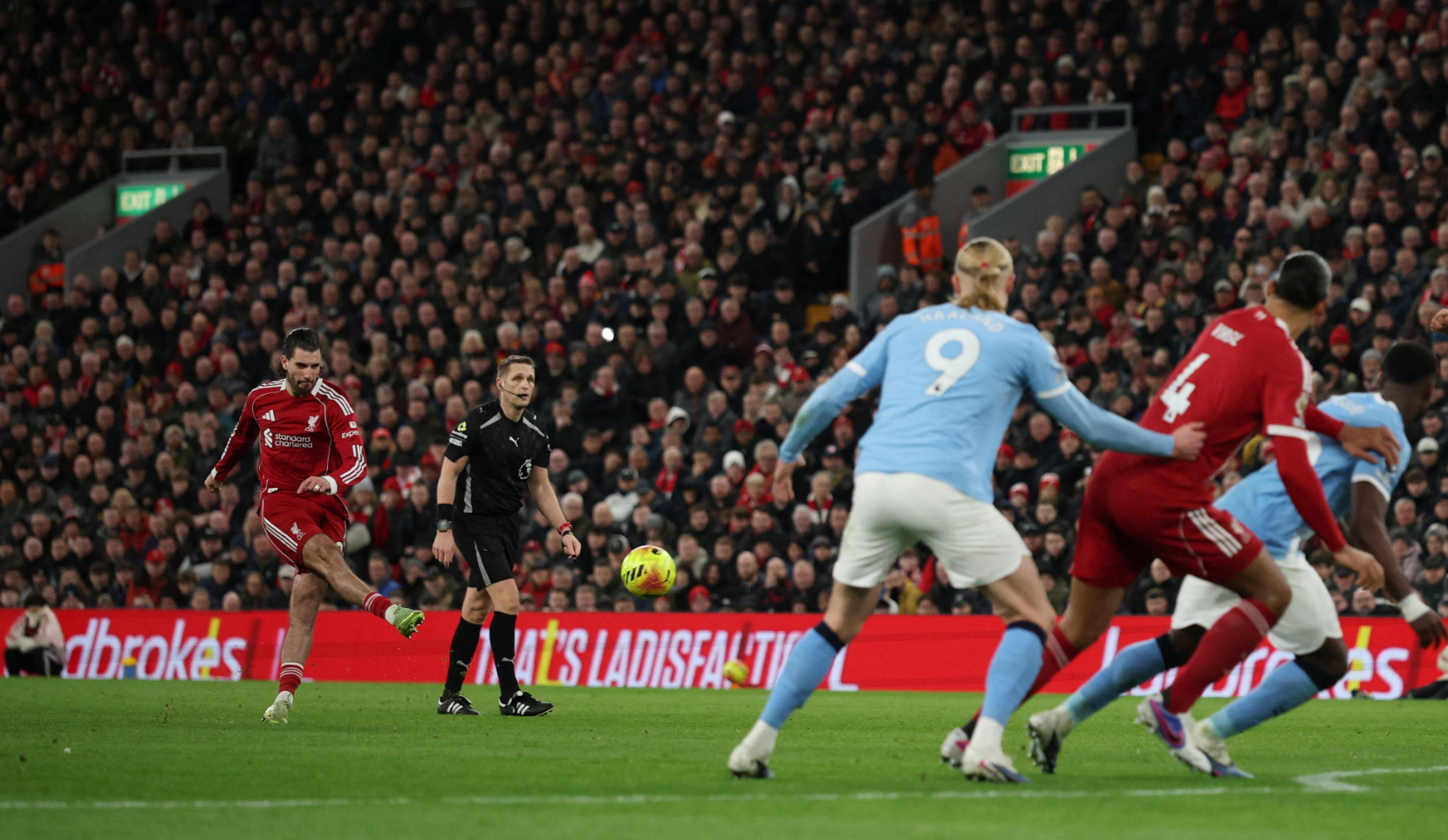 不过,曼城在最后10分钟展开疯狂反扑,曼城先是在第84分钟抓住利物浦后防松懈,由B席禁区捅射扳平比分,随后阿利松在禁区扑倒努内斯,曼城获得点球机会,此时比赛已经进入伤停补时阶段。哈兰德则轻松罚进点球,曼城在客场2-1逆转利物浦,最后时刻索博斯洛伊拉拽哈兰德,因为他已经是最后一名防守球员,所以被红牌罚下,他也将错过本轮与桑德兰的比赛。