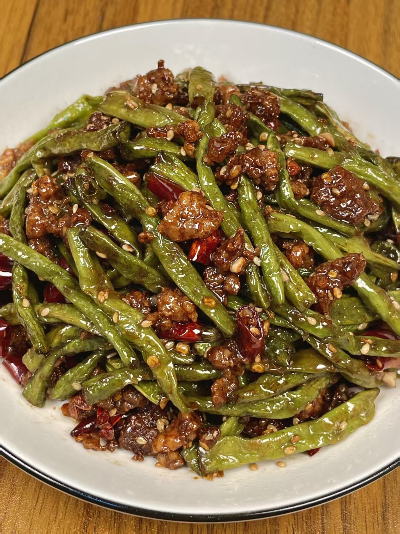 加入炒好的肉末,加 1.5 勺生抽、半勺蚝油、少许盐和鸡精,大火快速翻炒 2 分钟,让豆角均匀裹上调料,出锅前撒上白芝麻即可(外焦里嫩,香辣过瘾,越吃越香)。