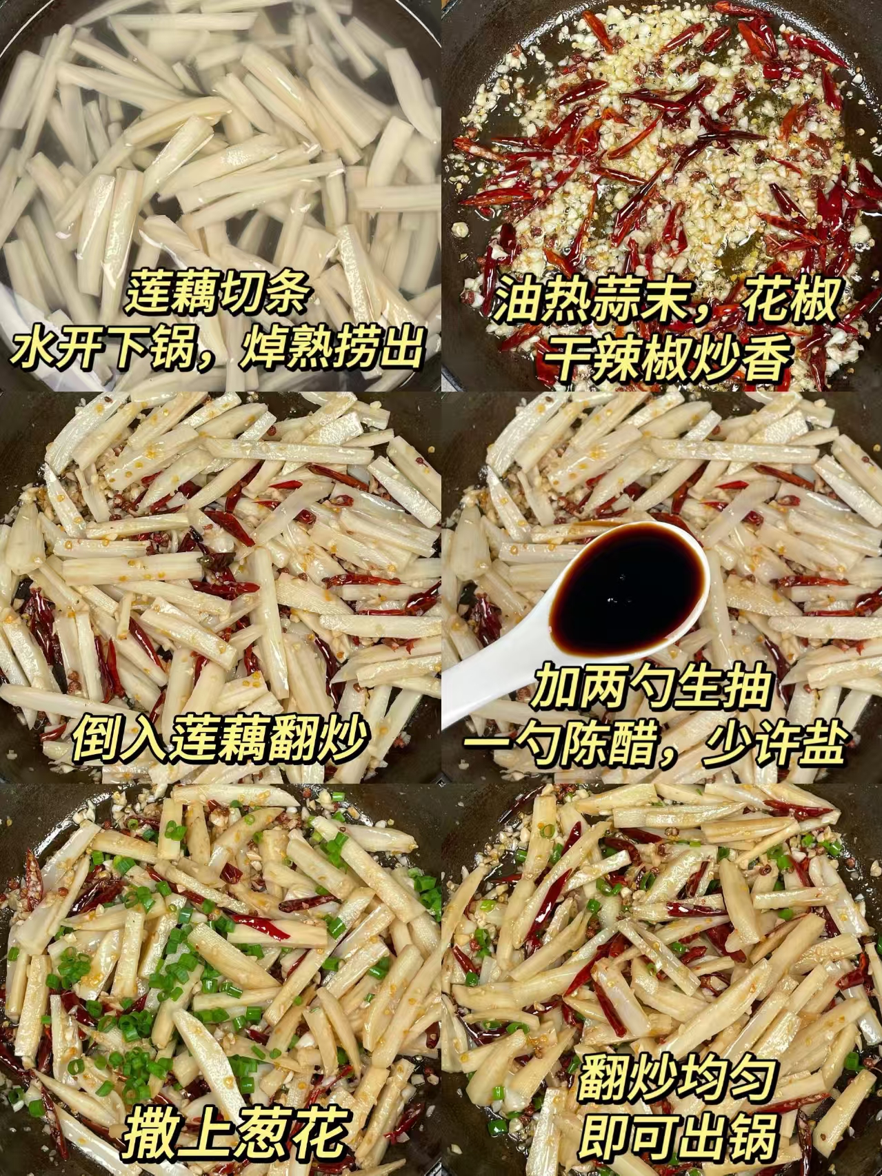 翻炒至调料均匀裹在藕条上,关火前撒上葱花,拌匀即可出锅(爽脆酸辣,一口下去超开胃,配饭直接多炫一碗)。