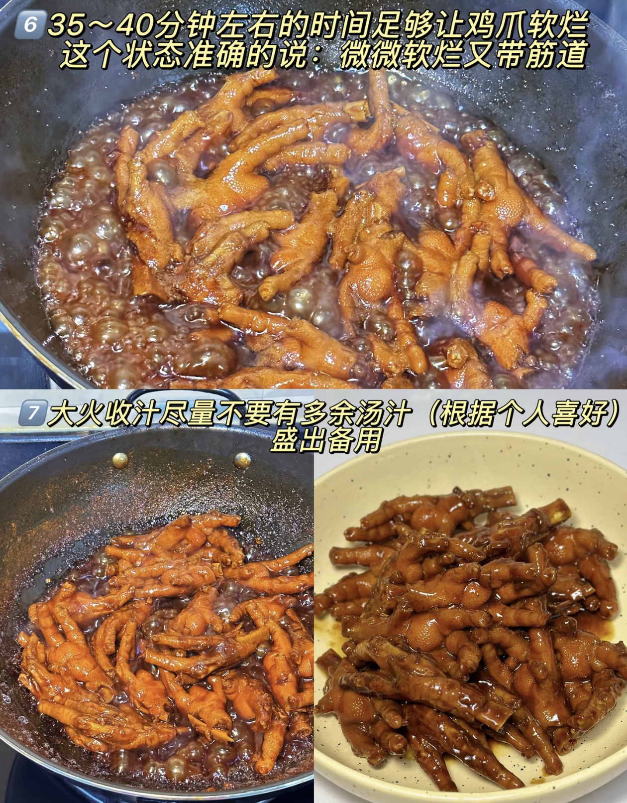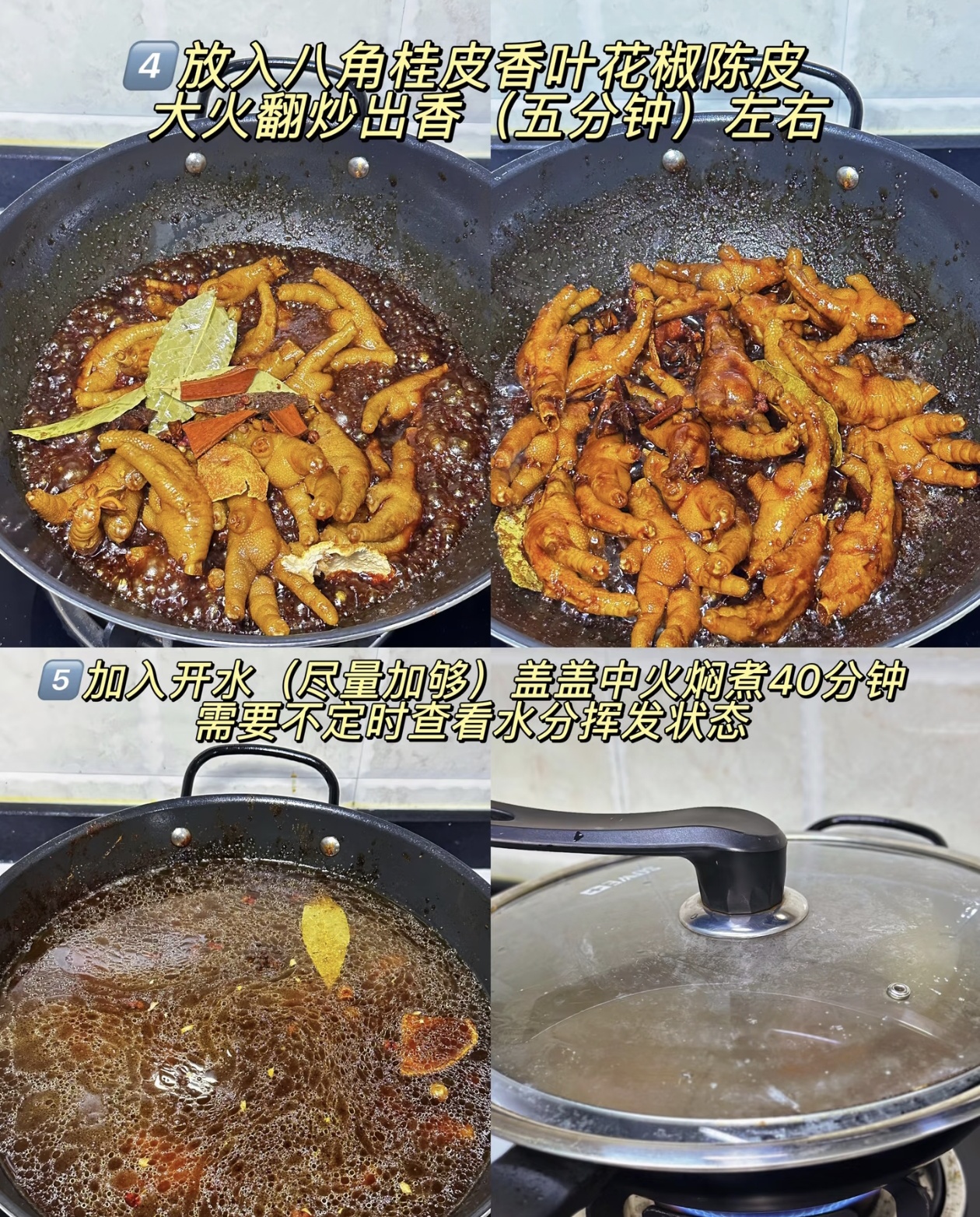第三步,卤制鸡爪。这一步是鸡爪软烂脱骨的关键!把八角、桂皮、香叶、花椒、陈皮这些香料丢进去,大火翻炒五分钟炒出香味。然后加入足量的开水,水量要没过鸡爪,盖上锅盖,中火焖煮40分钟。期间记得时不时看一下,别把水烧干了。40分钟后,鸡爪就达到了微微软烂又带点筋道的完美状态,这时候开大火收汁,把汤汁收得浓稠,盛出来备用。