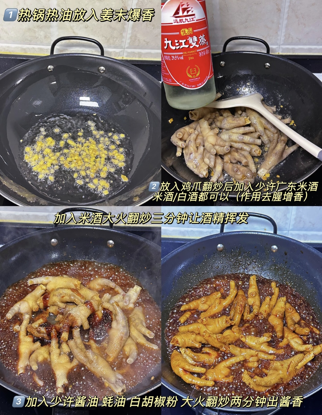 第二步,给鸡爪上个底味。热锅热油,先把姜末爆香,再下鸡爪翻炒,然后沿着锅边淋入少许广东米酒或者白酒,大火翻炒三分钟,让酒精挥发掉,既能去腥又能增香。接着加少许酱油、蚝油、白胡椒粉,大火爆炒两分钟,炒出浓郁的酱香味,让每只鸡爪都裹上诱人的红亮色泽。
