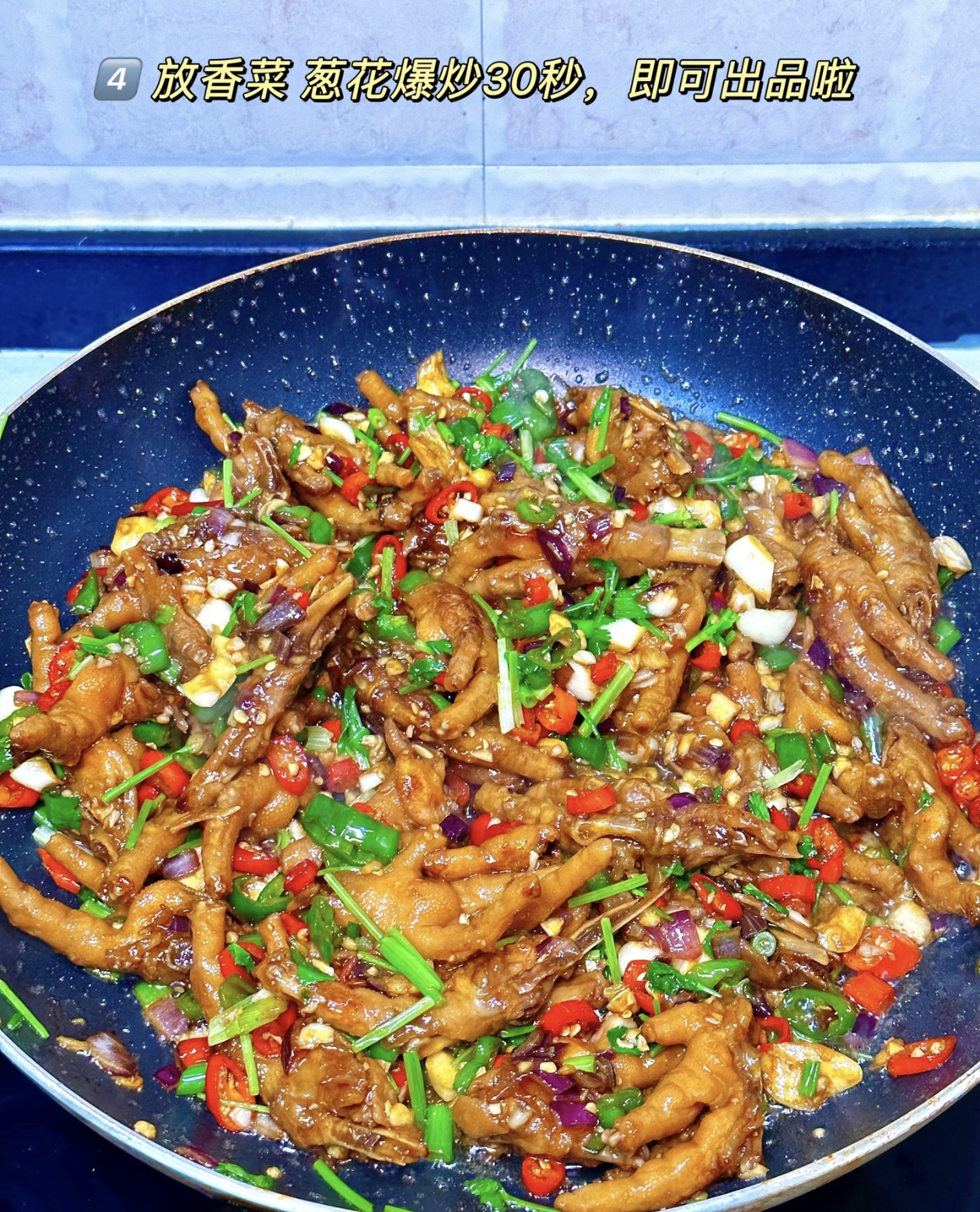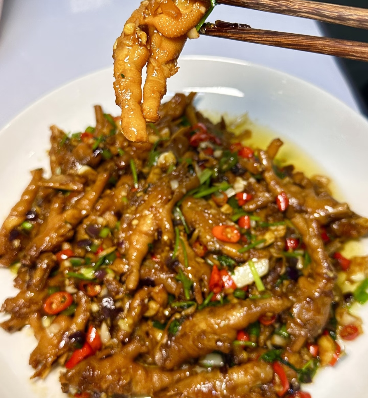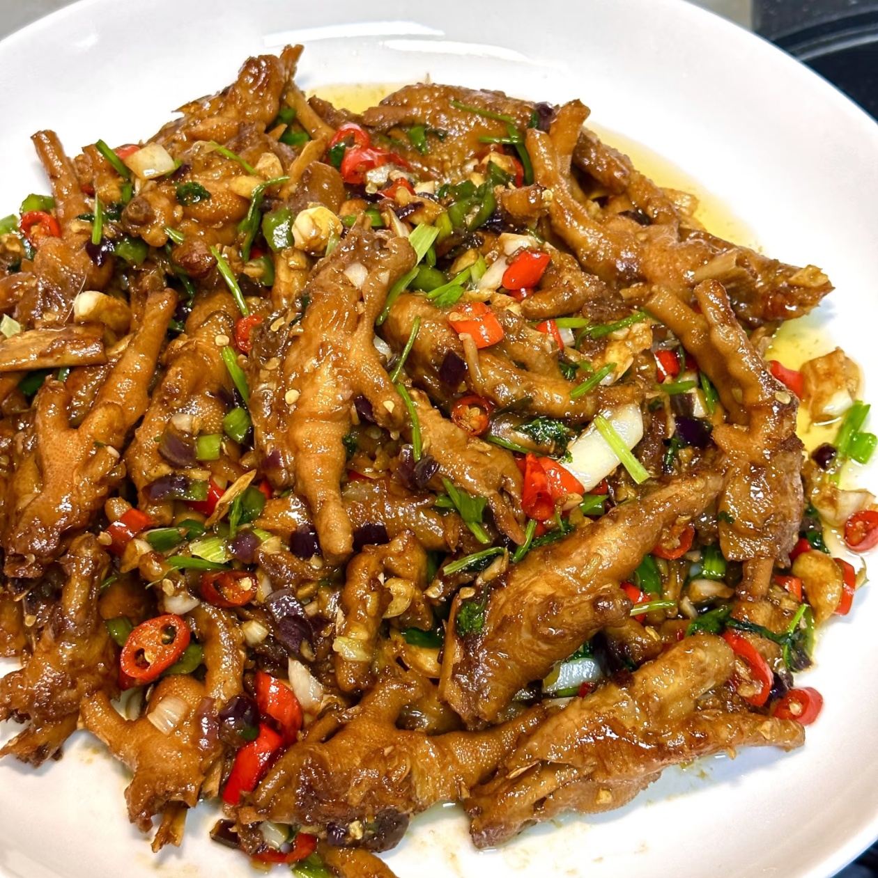 出锅的那一刻,真的太治愈了。红亮的鸡爪裹着浓稠的酱汁,点缀着红绿相间的辣椒和翠绿的香菜,光是看着就让人食欲大开。咬上一口,鸡爪的皮软糯Q弹,轻轻一抿就脱骨,卤香和鲜辣在嘴里爆开,洋葱的清甜又恰到好处地解了腻。无论是配着白米饭,还是小酌一杯,都堪称一绝。
