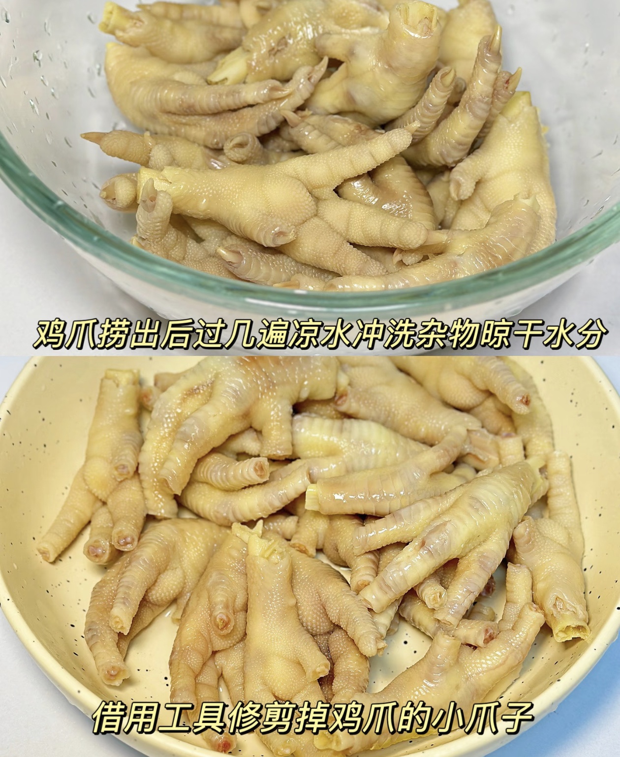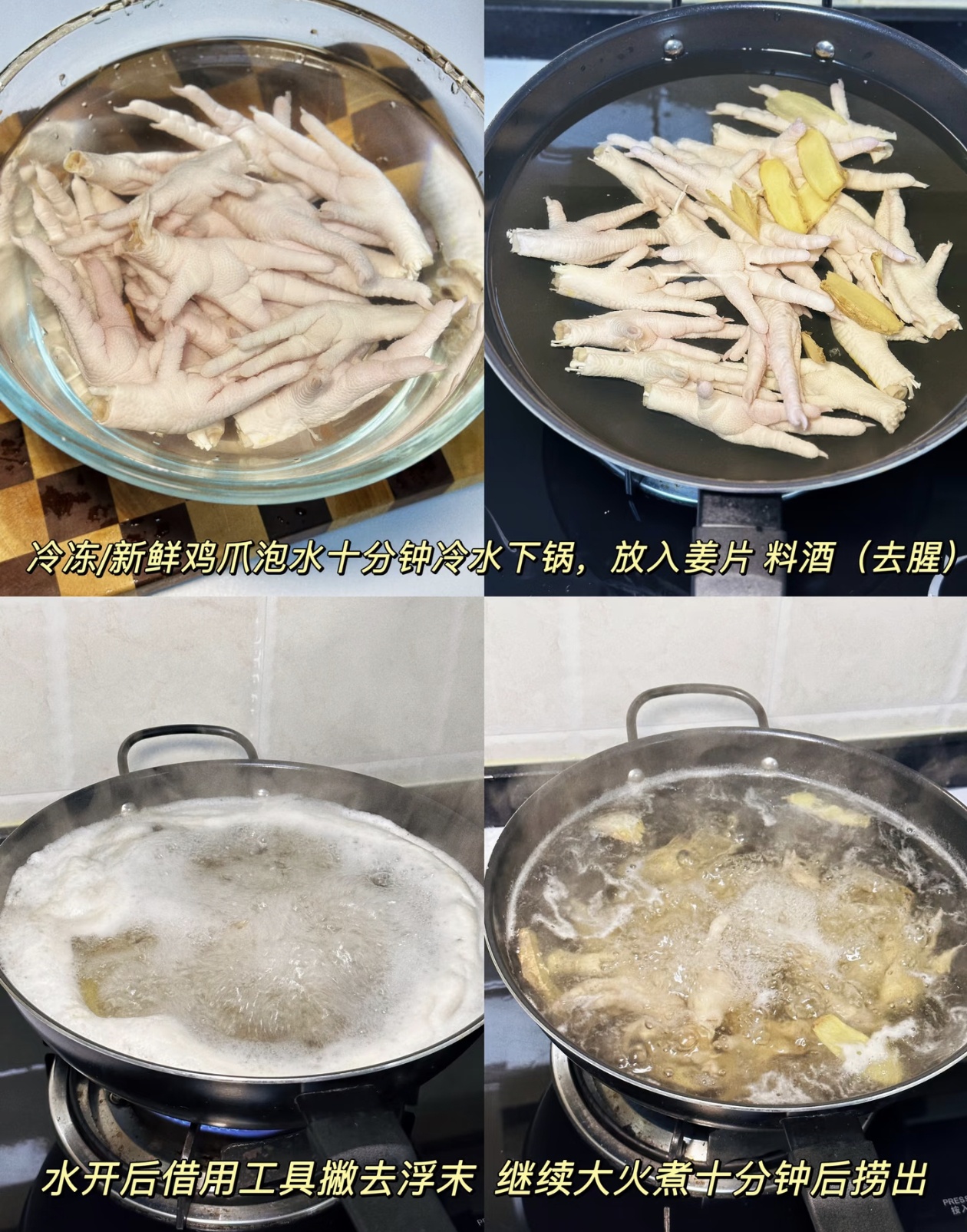 第一步,处理鸡爪。冷冻或者新鲜的鸡爪先泡十分钟血水,然后冷水下锅,丢几片姜,倒点料酒去腥。水开后撇掉浮沫,大火再煮十分钟,捞出来过几遍凉水,把杂质冲洗干净,晾干水分。记得把鸡爪的小爪子修剪掉,这样吃起来更方便,也更入味。