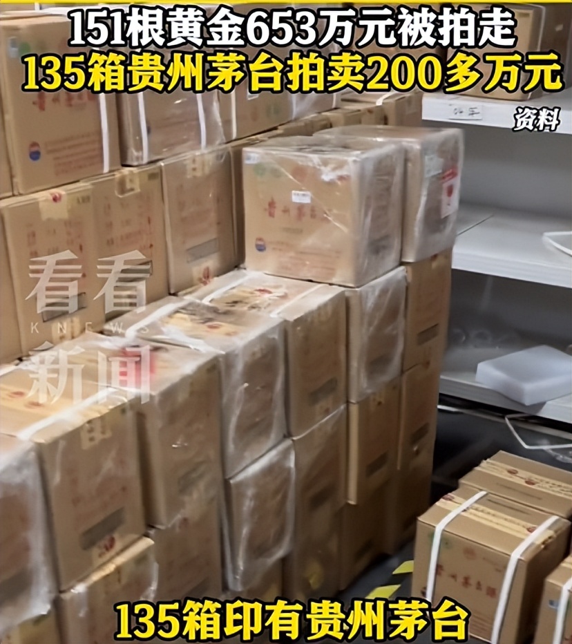 拍卖的酒类则大多数为成箱的茅台,其中成交价最高的单个标的是135箱印有贵州茅台酒字样的纸箱酒水,成交价超过200万元。