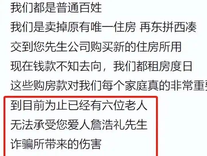 2023年12月,有受害者在微博晒出立案决定书控诉,自己卖掉唯一住房凑钱交至詹某某公司“购房”,最终钱款不知所踪。类似这样的受害者多达数百人,不少家庭因此濒临破产。