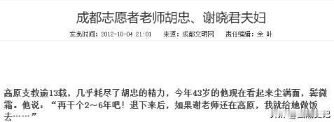 2000年,四川一女子刚生完孩子不久,丈夫突然对她说:“咱们去旅游吧”,妻子欣然同意,没想到到了目的地,妻子傻眼了,谁料正在这时,丈夫却说:“我不想走了……” 信息来源:成都文明网在2012年10月04日关于《成都志愿者老师胡忠、谢晓君夫妇》的报道。 2000年一次简单的旅游,却发生了一件感动全国的故事,故事的开头起源于一个美丽的谎言,然而在谎言背后,却是一份坚定的选择。 胡忠、谢晓君夫妇的故事,不仅仅是一个感人的支教故事,更是一曲讴歌奉献精神的赞歌,他们用行动展示了教育的重要和人生的价值所在。 他们犹如一束希望之光,照亮了高原孩子们的学习之路,同时也温暖了众多人的心,他们的经历能鼓舞许多人加入教育行列,一起努力打造更美好的明天。 他们的故事,值得我们深思和学习,在追求个人价值的同时,更要关注社会责任,用自己的行动去影响和改变世界。 时间回到2000年国庆假期,大多数人都能享受到轻松愉快的休息时光,谢晓君年纪轻轻,这次出行对她来说意味非凡。 彼时她的女儿只有三个月大,初为人母的喜悦还未散去,丈夫胡忠便提议去甘孜旅游,目的地是康定的一所孤儿学校——西康福利学校。 谢晓君欣然应允,全然不知这是一场精心策划的旅行,胡忠真正的目的并非旅游观光,而是去那里支教,他此前从报纸上了解到这所学校的情况,内心早已埋下了一颗奉献的种子。 孩子们见到远道而来的客人,脸上露出最灿烂的笑容,热情地打着招呼,破旧的教室被整理得干干净净,孩子们送上洁白的哈达,欢快地跳起了锅庄舞。 这一切深深触动了胡忠的心弦,他再也无法掩饰内心的想法,将自己的支教计划告诉了妻子,谢晓君看开了丈夫的坦白,也感受到了孩子们的期待,于是决定给予他们支持。 这个选择让这家人的人生道路发生了转变。 十几天前胡忠无意中翻到一则新闻,说西康福利学校正迫切需要教师。 这所学校主要接纳孤儿和有困难的学生,是一所提供福利的寄宿学校,由于地处偏远、条件艰苦,学校的师资力量严重匮乏,教师大多是志愿者,流动性很大。 有些老师甚至上一节课就离开了,孩子们面临着随时失去老师的困境,报纸上的信息,如同一道闪电击中了胡忠的内心。 他开始思考自己的人生价值,想要为这些孩子们做些什么,但这个想法也让他感到犹豫和不安。 他从未去过高原,不知道自己能否适应那里的生活;女儿尚在襁褓之中,妻子需要照顾;离开稳定的工作,也意味着未来的生活充满了不确定性。 在反复权衡之后,胡忠还是决定去康定看看,他悄悄把支教计划藏了起来,跟妻子女儿说是去西康玩,结果却来到了那所福利学校。 亲眼目睹了学校的现状和孩子们的渴望,胡忠的内心更加坚定了支教的决心,他最终向妻子坦白了自己的想法,并得到了谢晓君的全力支持。 回到成都后,胡忠辞去了工作,正式成为西康福利学校的一名教师,谢晓君带着女儿一起到了甘孜,夫妻俩携手努力,共同挑起了家庭生活的重担。 在高原的艰苦环境下,胡忠身兼数职,不仅要教授数学、政治等课程,还要照顾孩子们的日常生活,谢晓君则承担起了照顾女儿和家庭的责任,同时积极参与学校的各项工作。 2007年谢晓君做出了一个更加重要的决定——她将自己的关系调到了甘孜,成为一名正式的本地教师。 这意味着他们一家彻底扎根在了这片土地上,将自己的青春和热血奉献给了高原教育事业,十多年的坚守与付出,最终迎来了鲜花和掌声。 2011年胡忠、谢晓君夫妇荣获感动中国10周年2011年度人物称号,他们的故事感动了无数人,也让更多人关注到支教老师这个群体。 面对荣誉他们始终保持着谦逊的态度,并承诺将继续留在甘孜,帮助更多贫困孩子实现读书的梦想,他们的故事并非个例。 在广袤的中国大地上,还有无数像胡忠、谢晓君夫妇一样的支教老师,他们默默奉献,用爱和知识点亮孩子们的未来。 他们的事迹值得我们铭记和敬佩,胡忠和谢晓君,他们不是英雄,也不是伟人,他们只是普普通通的老师,但正是他们这种平凡的坚守,才更显伟大。 他们的经历总在提醒我们,努力活出更精彩的自己,去打造一个更美好的明天。