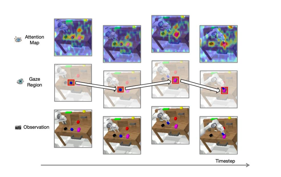 那么,“隐式定位”到底是什么意思?具体又该如何实现?丁鹏翔给了 DeepTech 类比:人类在执行精细操作时,虽然看到的是整个场景,但真正聚焦的只有一小片区域。如果指令是“拿杯子”,哪怕桌上放了十样东西,人类的视觉焦点会自动锁定在杯子上,周围的一切都变得模糊。这种行为在视觉科学中叫做“凝视”(gaze)。