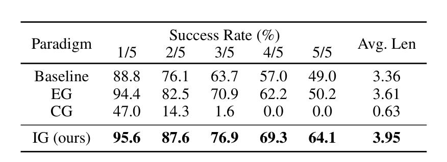 另一种是"思维链定位"(CoT Grounding),如 ECoT 和 GraspVLA,让模型先输出目标的边界框坐标,再输出动作。这种方式在理论上很漂亮,但实验结果显示它甚至不如基线。在 CALVIN 基准测试中,CoT 方式的 5 步连续任务成功率几乎为零。原因可能在于,坐标形式的定位信息对 VLA 模型来说并不是一种高效的引导信号,同时要输出精确坐标和精确动作值,给训练带来了额外负担。