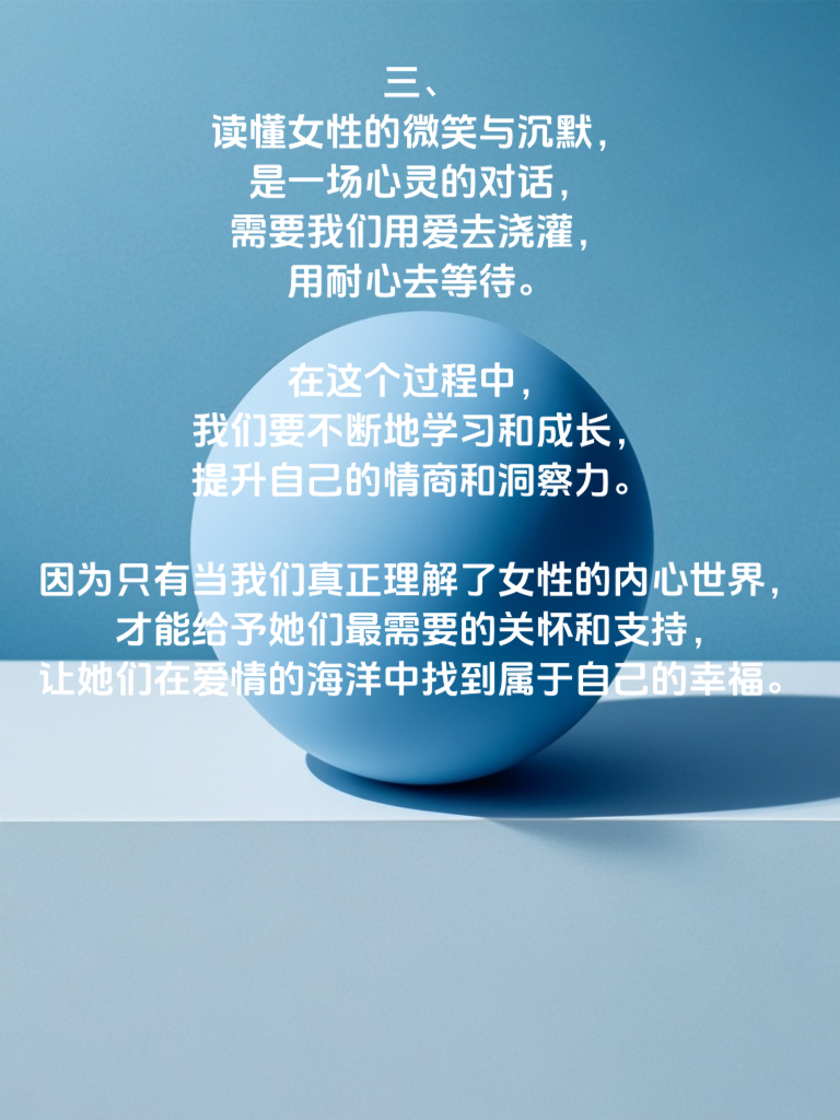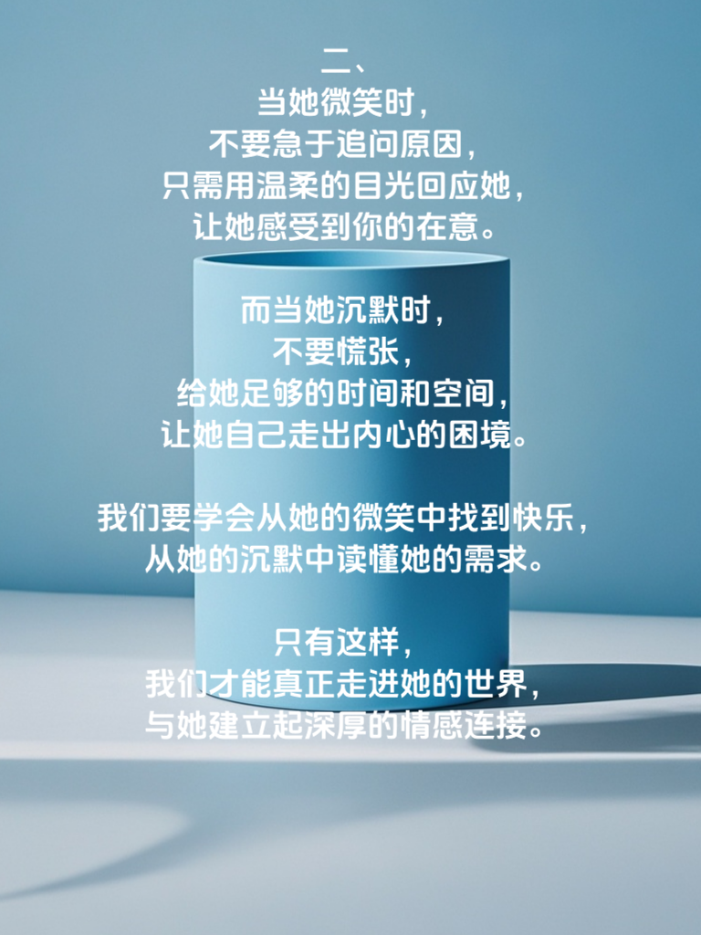 一、女性的微笑,宛如春日的暖阳,温暖而神秘。那微微上扬的嘴角,仿佛在诉说着内心的喜悦与温柔,却又带着一丝含蓄。当她对你微笑时,那是她对你的一种认可与亲近,是她对你打开心扉的第一步。而沉默,则如同一座静谧的山谷,深沉而难以捉摸。有时,她的沉默是在思考,是在整理自己的思绪;有时,却是在隐藏内心的不安与痛苦。读懂她的微笑与沉默,需要我们用心去感受,去捕捉那细微的变化。 二、当她微笑时,不要急于追问原因,只需用温柔的目光回应她,让她感受到你的在意。而当她沉默时,不要慌张,给她足够的时间和空间,让她自己走出内心的困境。我们要学会从她的微笑中找到快乐,从她的沉默中读懂她的需求。只有这样,我们才能真正走进她的世界,与她建立起深厚的情感连接。 三、读懂女性的微笑与沉默,是一场心灵的对话,需要我们用爱去浇灌,用耐心去等待。在这个过程中,我们要不断地学习和成长,提升自己的情商和洞察力。因为只有当我们真正理解了女性的内心世界,才能给予她们最需要的关怀和支持,让她们在爱情的海洋中找到属于自己的幸福。