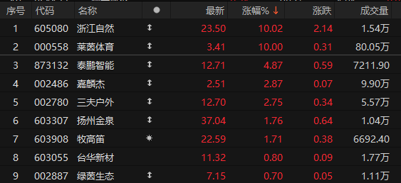 户外露营概念股表现活跃 浙江自然、莱茵体育涨停