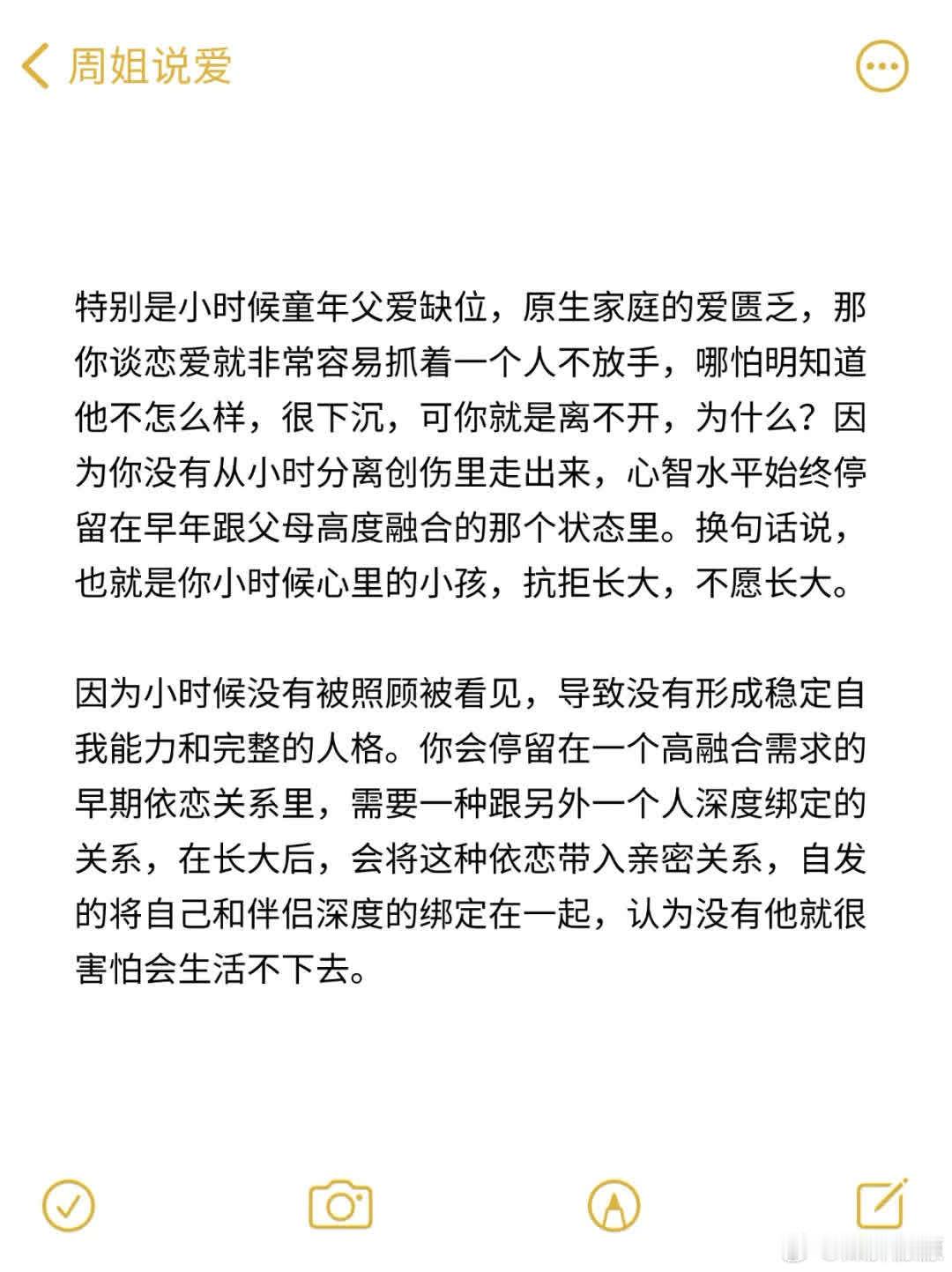 尤其如果小时候童年父爱缺位,原生家庭的爱匮乏,那你谈恋爱就非常容易抓着一个人不放手,哪怕明知道他不怎么样,很下沉,可你就是离不开。为什么?因为你没有从小时分离创伤里走出来,心智水平始终停留在早年跟父母高度融合的那个状态里。换句话说,也就是你小时候心里的小孩,抗拒长大,不愿长大。
