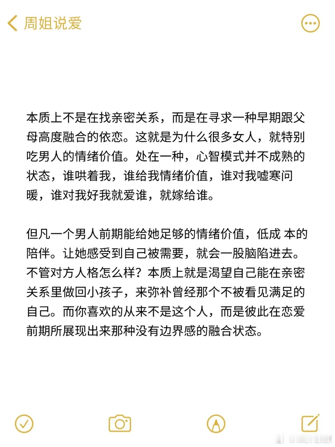 这就是为什么很多女人,就特别吃男人的情绪价值。处在一种,心智模式并不成熟的状态,谁哄着我,谁给我情绪价值,谁对我嘘寒问暖,谁对我好我就爱谁,就嫁给谁。但凡一个男人前期能给她足够的情绪价值,低成 本的陪伴。让她感受到自己被需要,就会一股脑陷进去。不管对方人格怎么样?本质上就是渴望自己能在亲密关系里做回小孩子,来弥补曾经那个不被看见满足的自己。而你喜欢的从来不是这个人,而是彼此在恋爱前其所展现出来那种没有边界感的融合状态。
