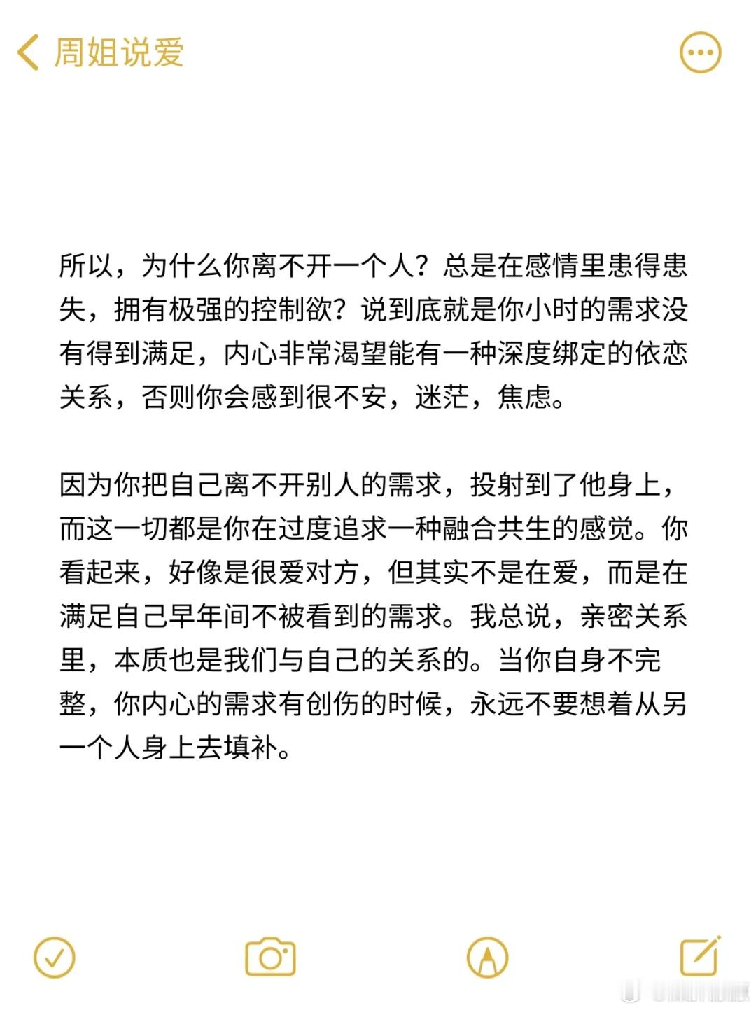 当你在亲密关系里,对对方产生过度的依恋和爱,比如你感觉离不开他,时刻都想跟他黏在一起,本质上不是因为你真的很爱他,而是因为你不爱自己,你把自身的需求全部投射到他身上了。