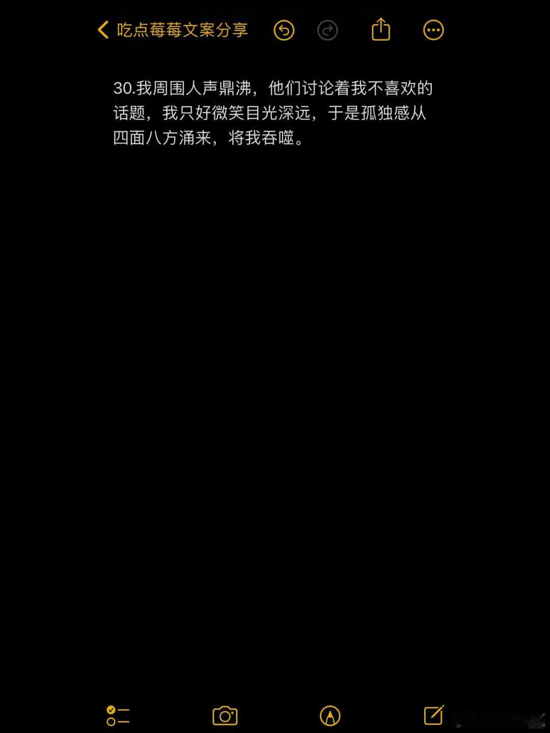 30.我周围人声鼎沸,他们讨论着我不喜欢的话题,我只好微笑目光深远,于是孤独感从四面八方涌来,将我吞噬。