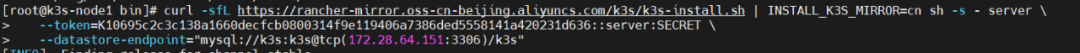 curl -sfL https://rancher-mirror.oss-cn-beijing.aliyuncs.com/k3s/k3s-install.sh | INSTALL_K3S_MIRROR=cn sh -s - server \--token=SECRET \--datastore-endpoint="mysql://k3s:k3s@tcp(172.28.64.151:3306)/k3s"# 查看主节点状态,验证节点是否接入kubectl get node# 获取server tokencat /var/lib/rancher/k3s/server/token