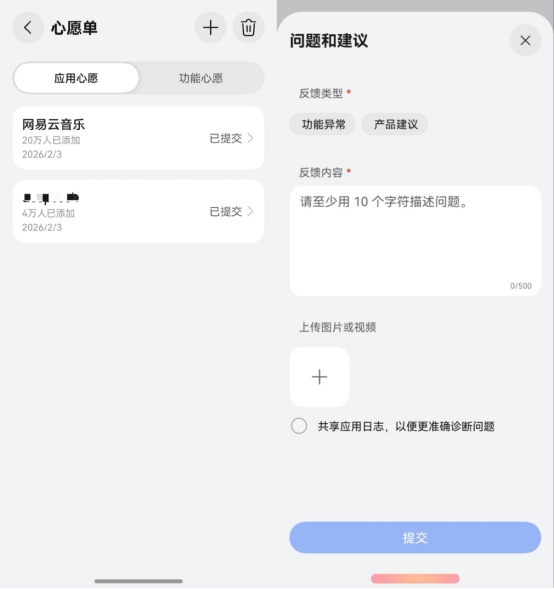 想用的App在鸿蒙应用市场找不到,可以去“应用心愿单”提交需求;当然使用中遇到任何不便或者有建议,也能通过“反馈建议”告诉华为官方来帮助解决。
