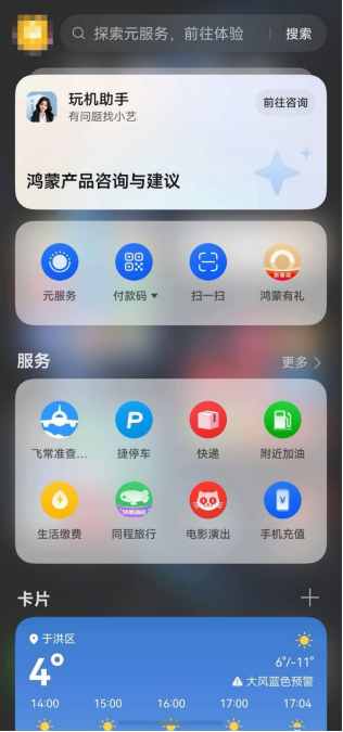 非常好找,从手机桌面向右滑动,进入华为负一屏。在顶部动态服务卡片区,就能看到“鸿蒙产品咨询与建议”卡片。要注意的是,动态卡片是轮播展示的,有时不在最上层,这时只需上下划动卡片区域,或者展开卡片列表,就能找到它啦。