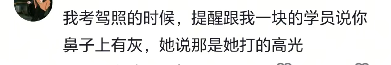 我考驾照的时候,提醒跟我一块的学员说你鼻子上有灰,她说那是她打的高光
