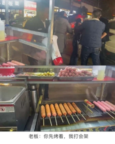 老板:你先烤着,我打会架