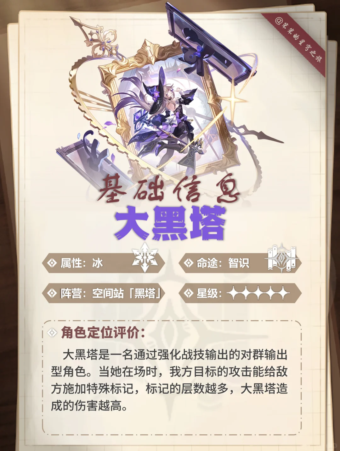 🐱大家好,我是笨笨的铲屎官 今天给大家带来的是大黑塔的培养攻略 大家都抽到大黑塔了吗 ▶推荐没有冰系、智识角色的老玩家抽取 以应对深渊冰弱、群伤buff的环境 ▶萌新可以直接抽 3.0就可以直接毕业配队