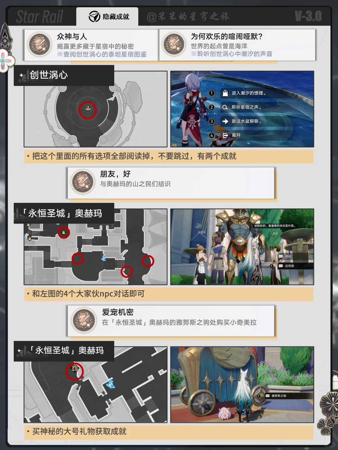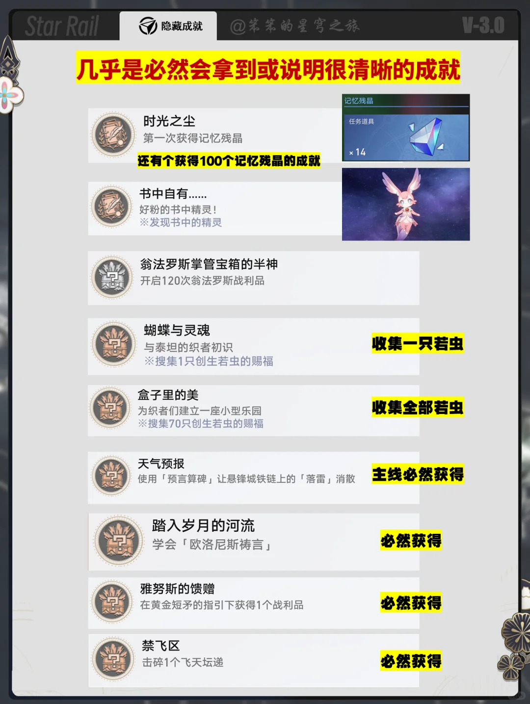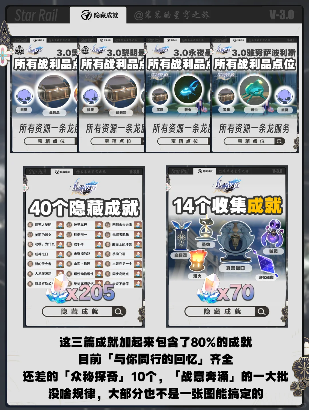 🐱大家好,我是笨笨的铲屎官 今天给大家带来的是第三批隐藏成就 这一次一共43个 加上之前的第一批40个 第二批14个 加起来有97个成就了 ▶与你同行的回忆合集都全了 就差「众秘探奇」的10个 和「战意奔涌」的一批战斗成就 因为这些不成系列,而且不是一张图就能写清楚 所以到时候就看情况补充