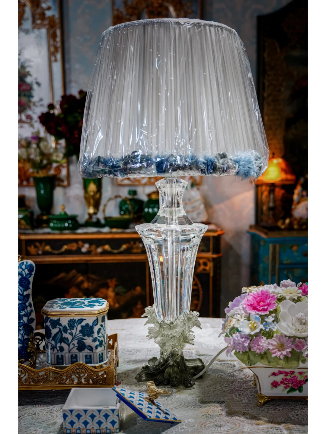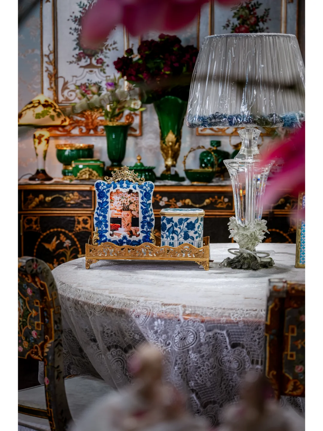 凑近看,瓷质细腻得像羊脂玉,触手温润。青花图案更是一绝,每一笔都带着传统工笔画的细腻,仿佛能把人拽进悠悠古画里。而铜艺部分,像是给青花瓷披上了一件华丽外衣。做旧的铜边,纹理清晰,带着岁月沉淀的厚重感,跟青花瓷搭配,刚柔并济,复古又高级。