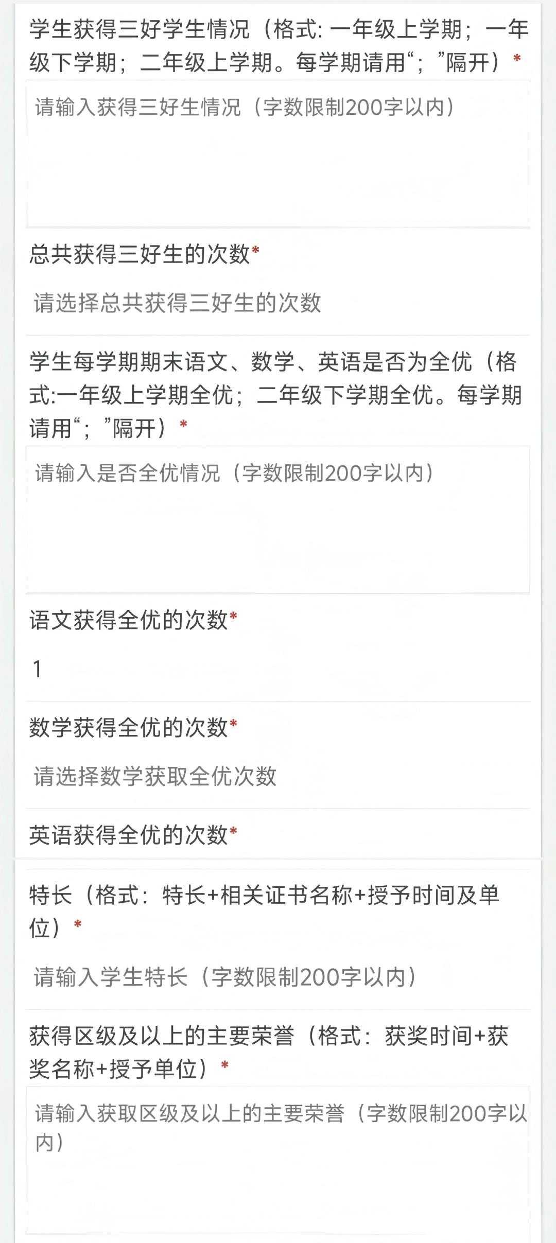 登记覆盖1~5 年级:需填写三好学生获得情况;区级及以上综合表彰类荣誉限填 3 项(如省好少年、区三好生等);