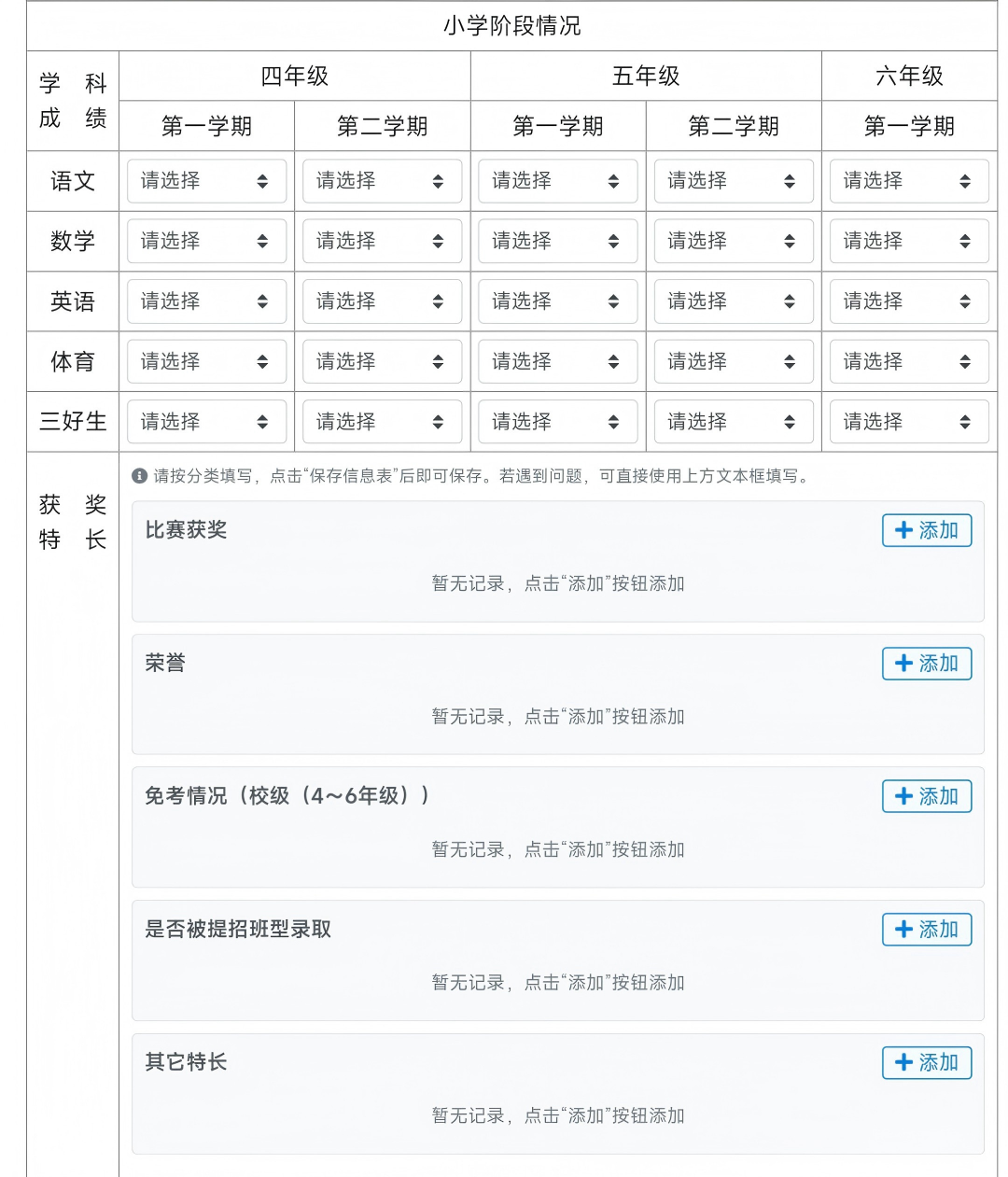 核心登记要求聚焦四~六年级:语数英 + 体育成绩、三好学生情况是基础;比赛获奖、荣誉、