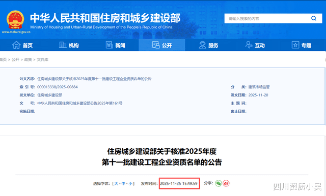 11月25日,住建部发布关于核准2025年度第十一批建设工程企业资质名单的公告。