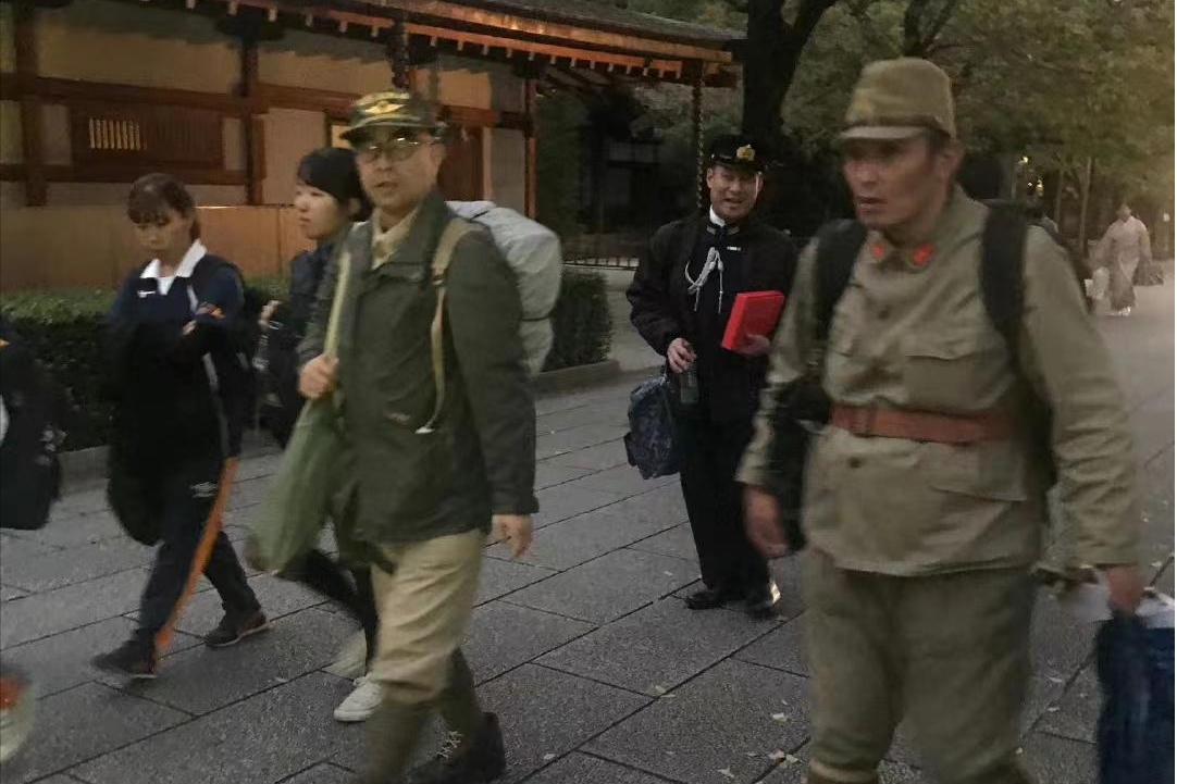 靖国神社前的日本右翼身着旧日军军装招摇过市